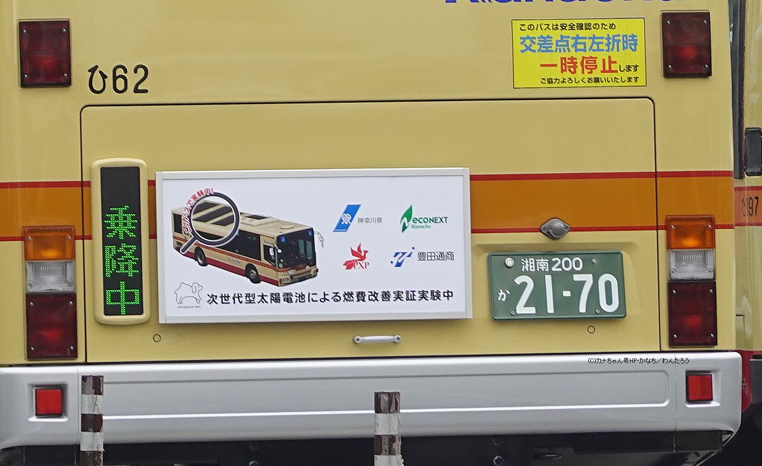 2017年12月投入の2PG-MP38FK(ひ62)です。 平塚営業所管内で次世代型太陽電池を搭載した実証実験が始まりました。 今年7月18日公式サイトにて告知されていた神奈川県の新プロジェクトの一環で、燃費の向上と環境負荷の低減を目的とし豊田通商株式会社、株式会社PXPの技術的支援等により行われています。 屋根上に見える黒いシート状の物がペロブスカイト太陽電池のようで薄型で軽量、柔軟性が特徴のようです。複数台で実証されている模様です。撮影 わんたろう様  |