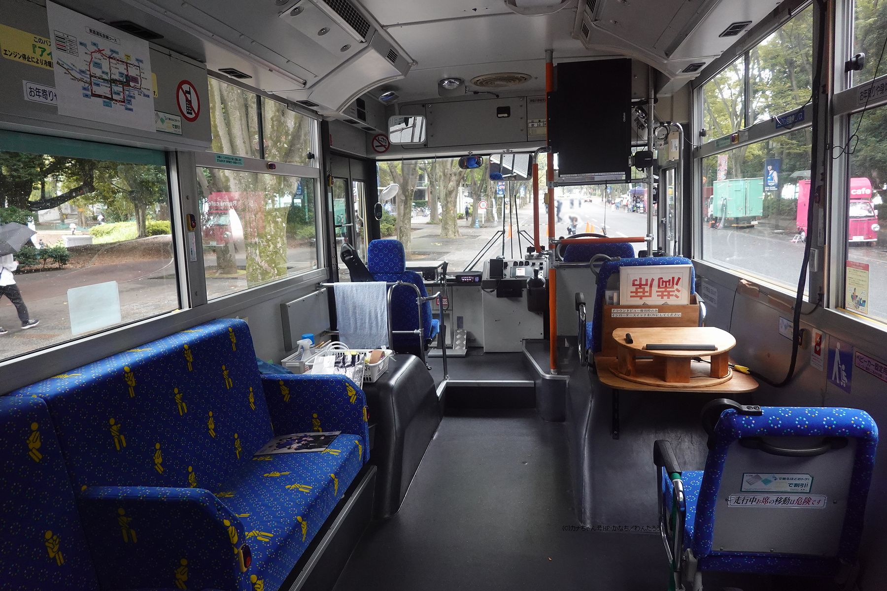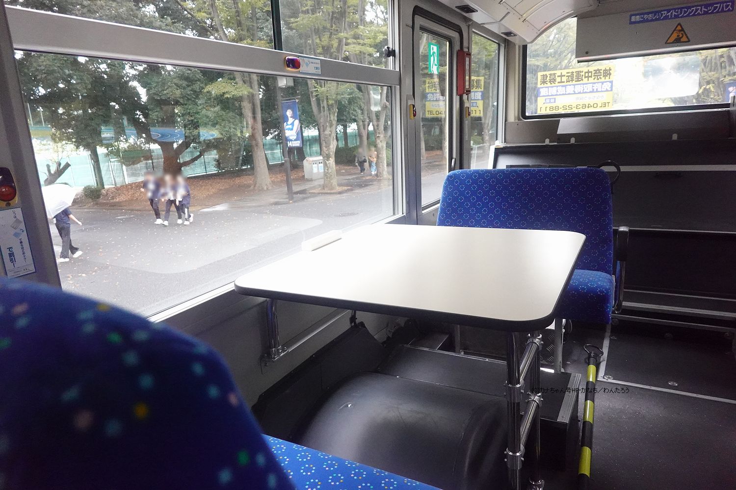 こちらは「ひ15」号車。外観については窓配置等も含め、広告枠がない以外は一般カラーのワンステップ同型式と同一です。座席シートはリクライニング機能が省かれており、ボトルクーラーやカップホルダーも付いていません。 |
