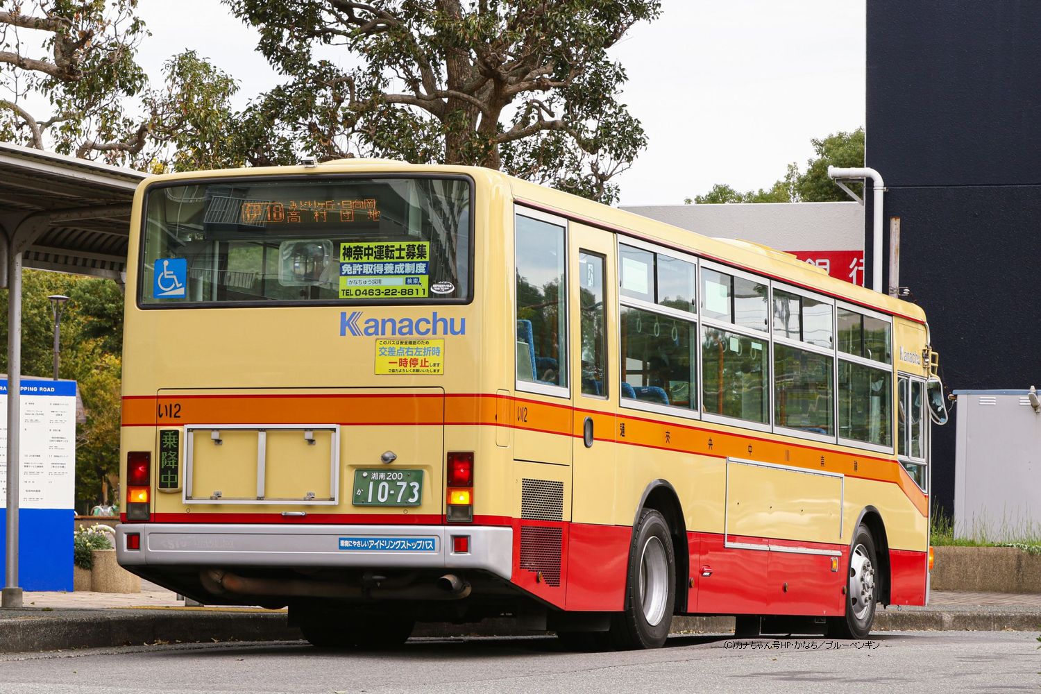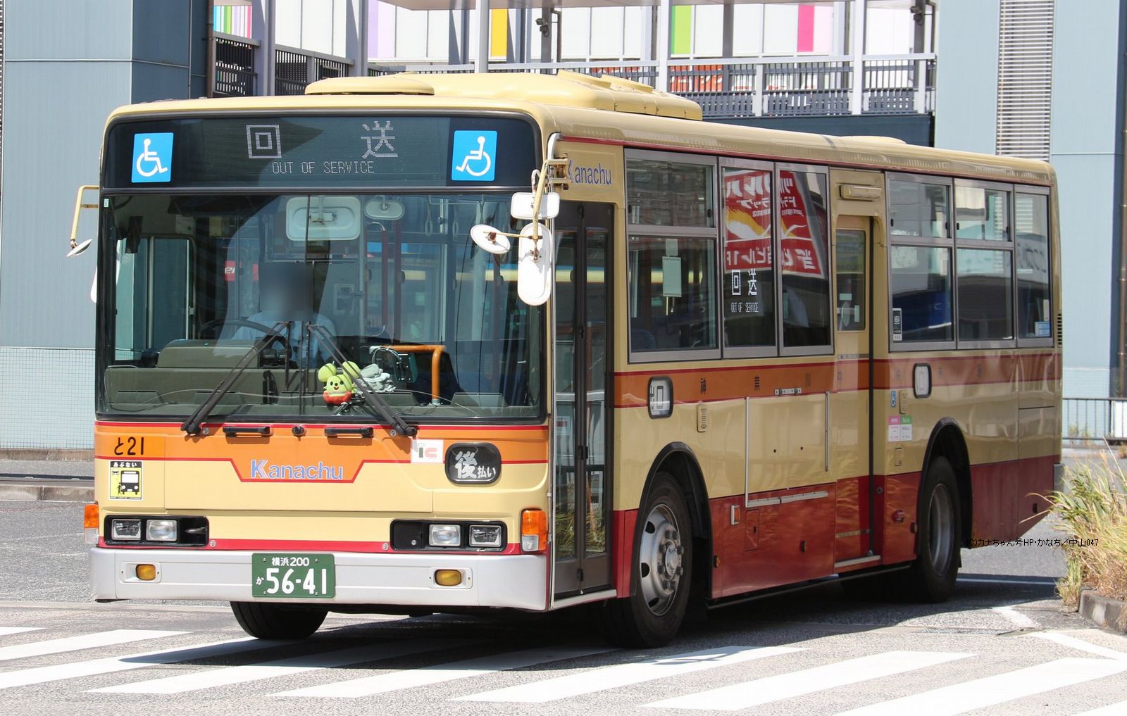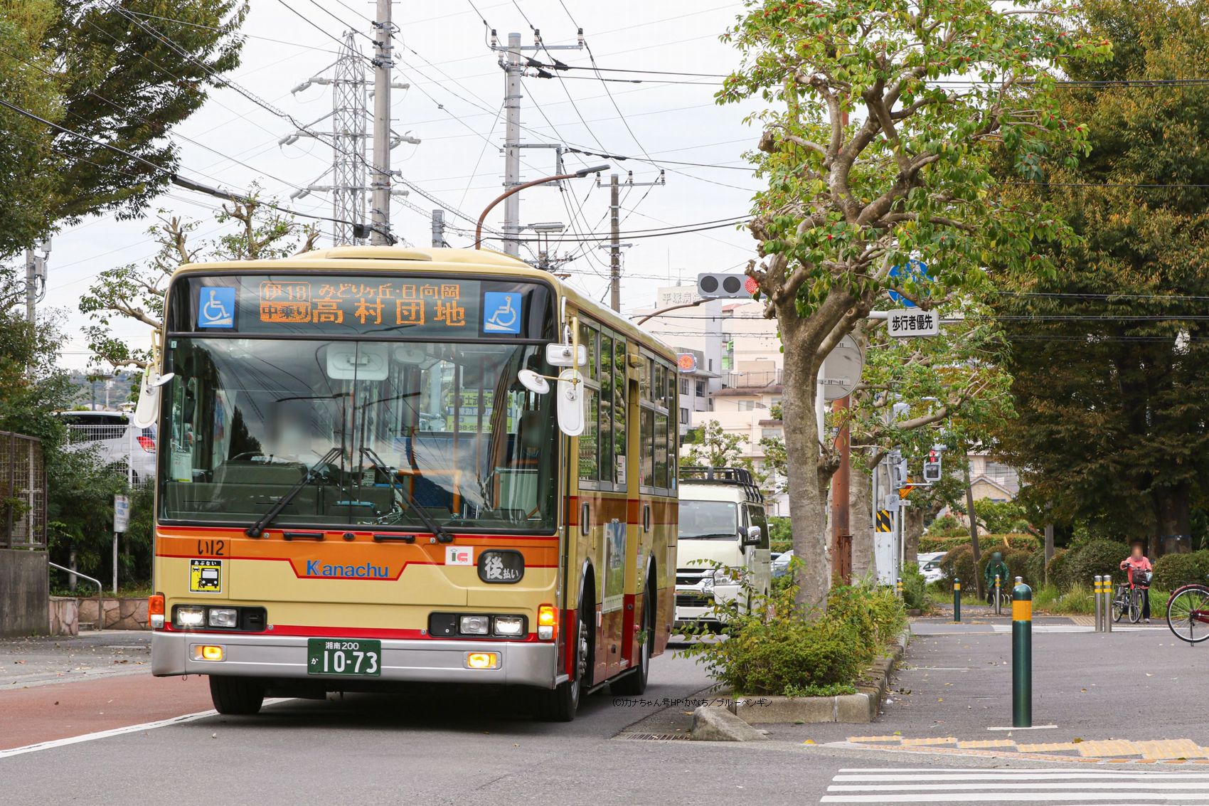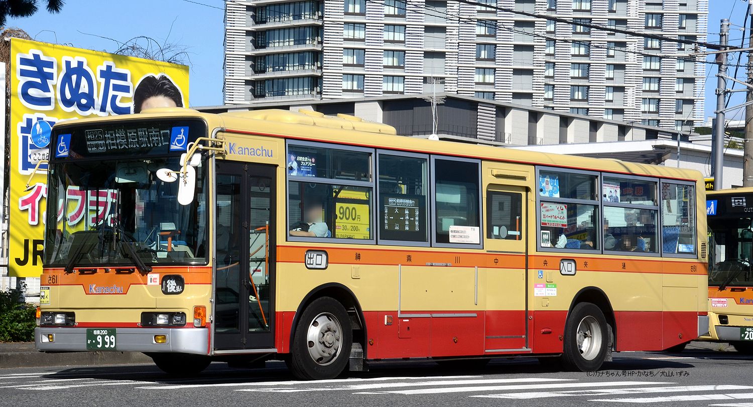 こちらは元YAMATE LINER仕様の「お98」です。登場から2ヶ月ちょっとで「KANACHU BUS」ロゴへ変更されています。基本的に11・60系統の運用はYAMATEロゴ仕様に譲っていますが、現在も時々運用に入ります。 |