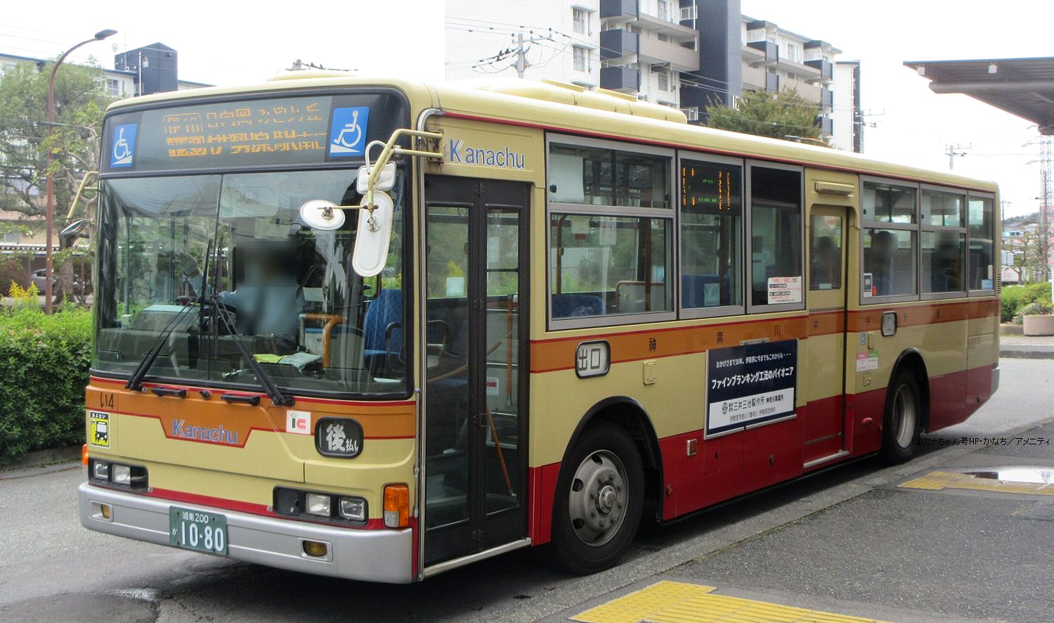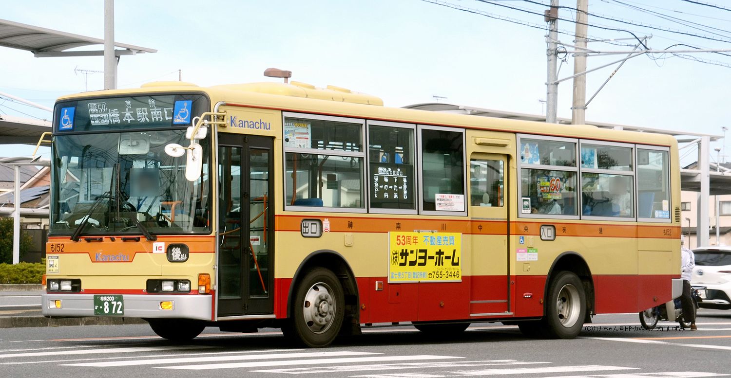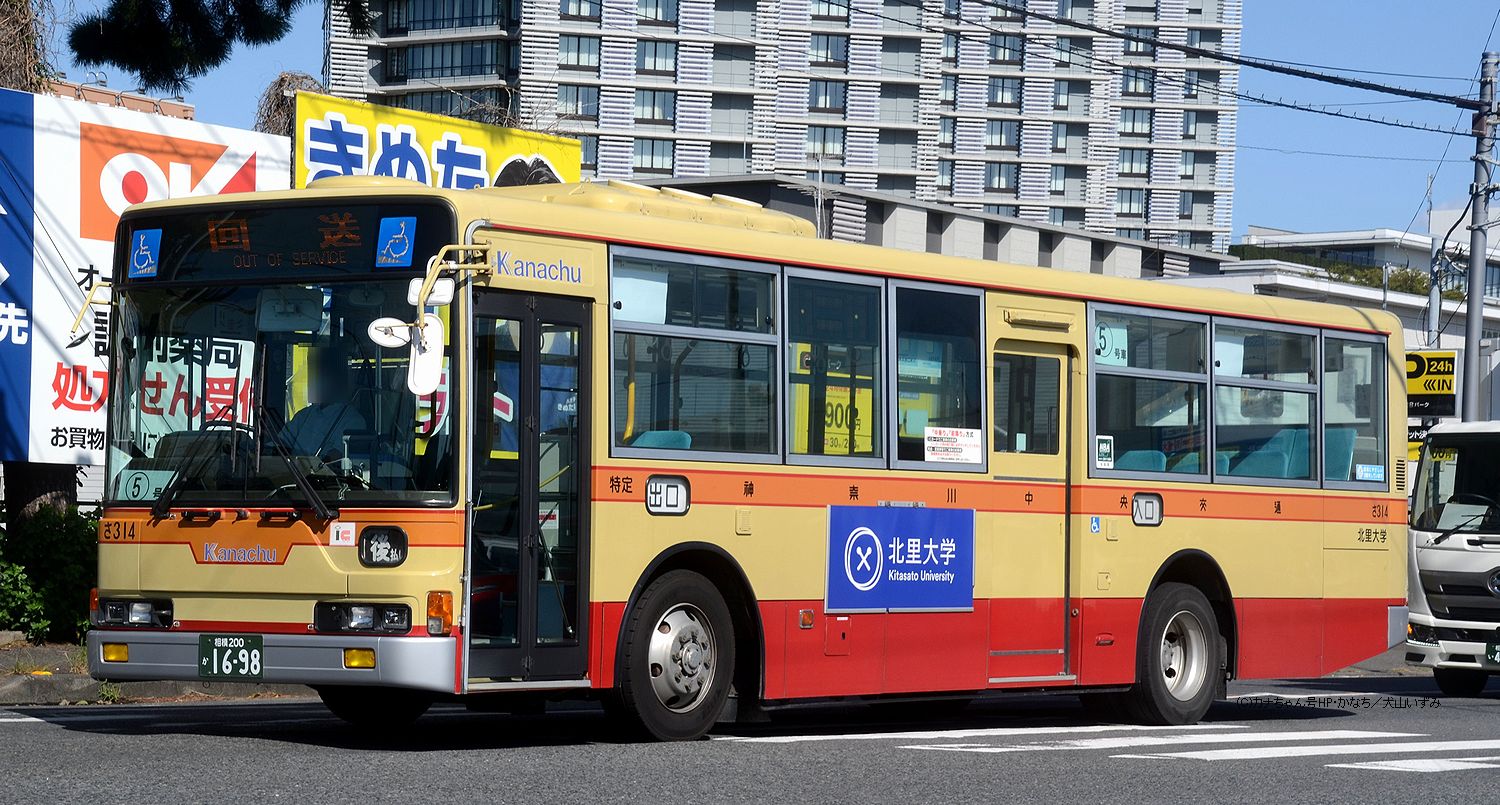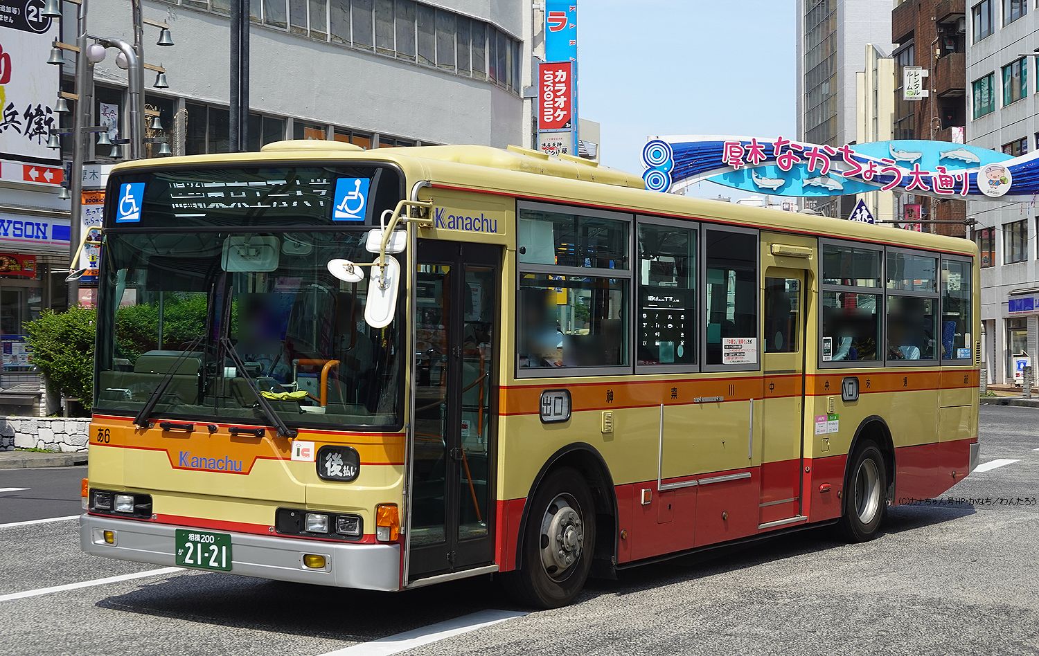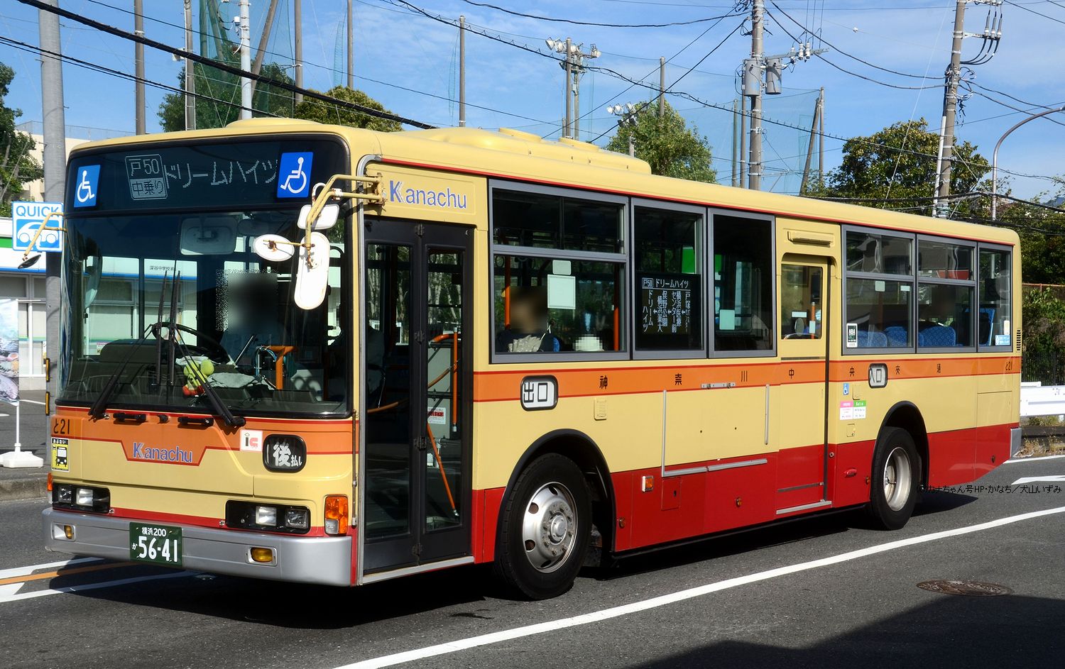 こちらは元YAMATE LINER仕様の「お98」です。登場から2ヶ月ちょっとで「KANACHU BUS」ロゴへ変更されています。基本的に11・60系統の運用はYAMATEロゴ仕様に譲っていますが、現在も時々運用に入ります。 |