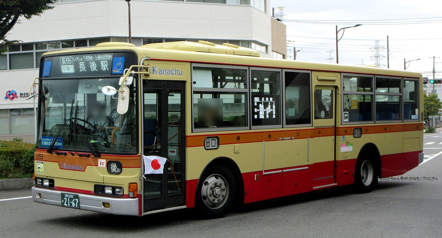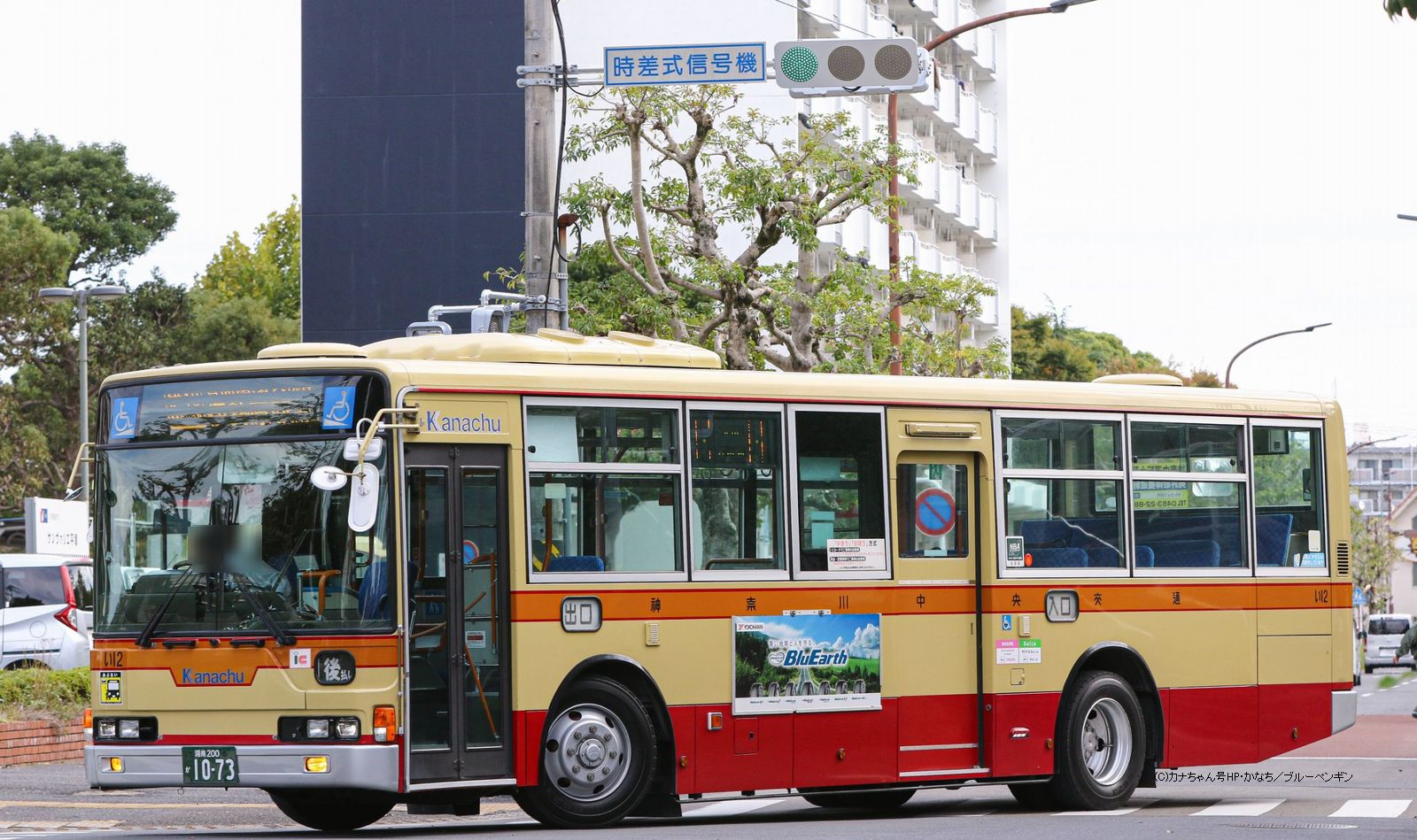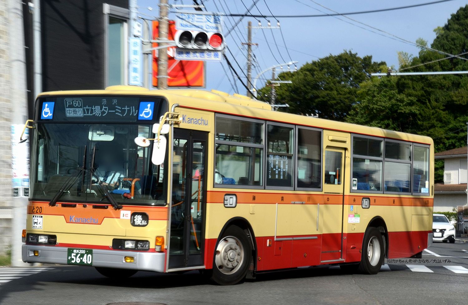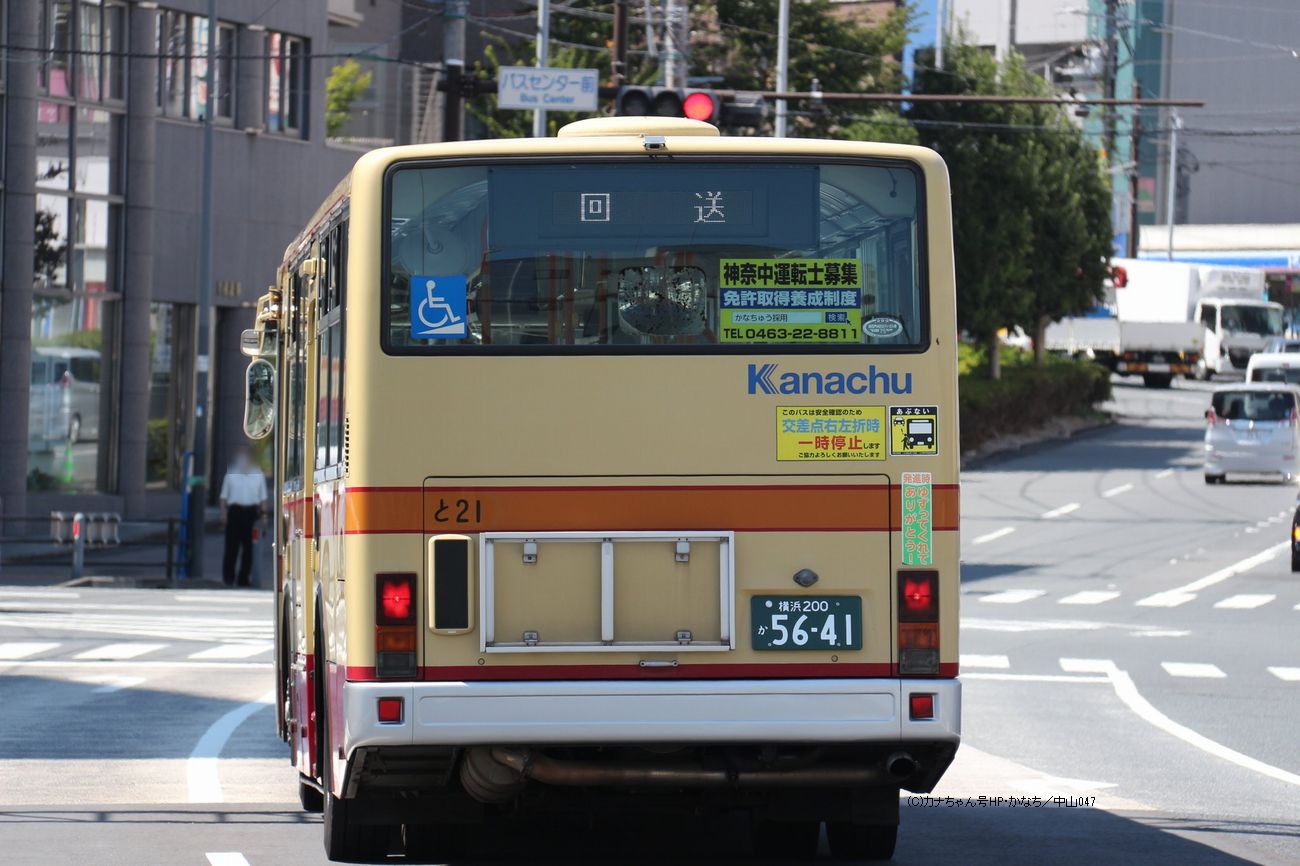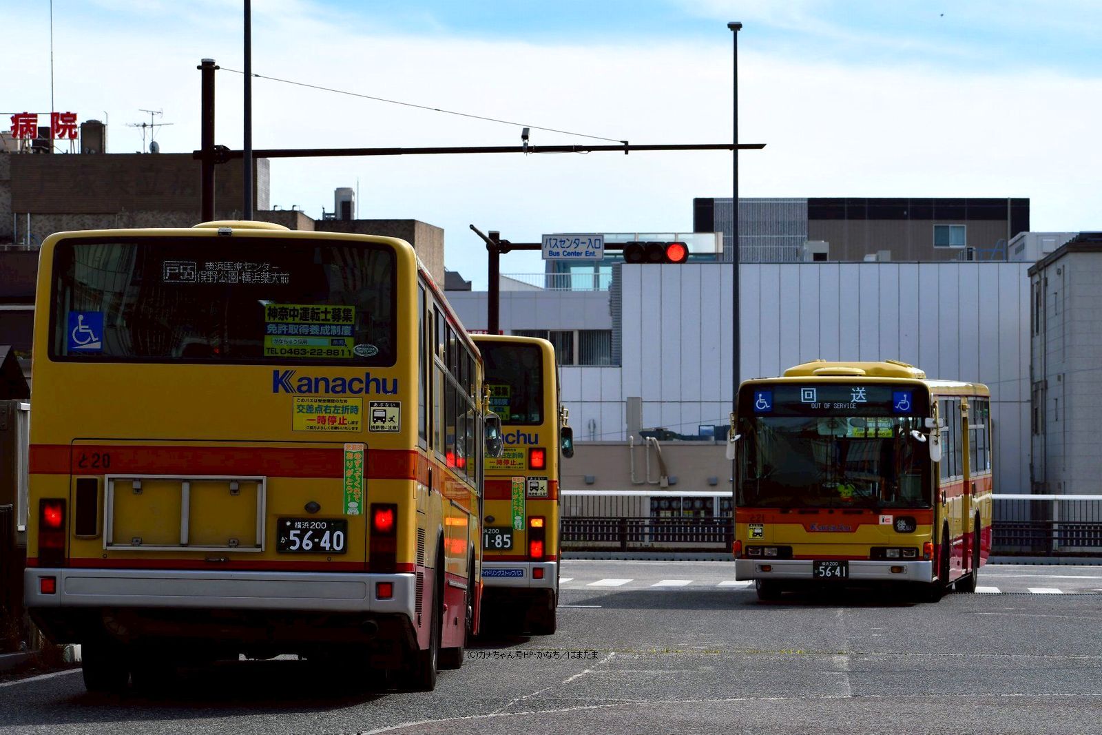 こちらは元YAMATE LINER仕様の「お98」です。登場から2ヶ月ちょっとで「KANACHU BUS」ロゴへ変更されています。基本的に11・60系統の運用はYAMATEロゴ仕様に譲っていますが、現在も時々運用に入ります。 |