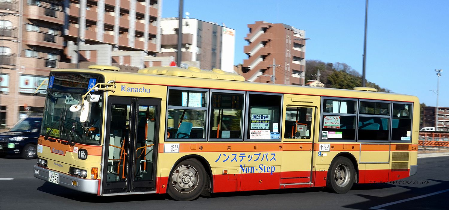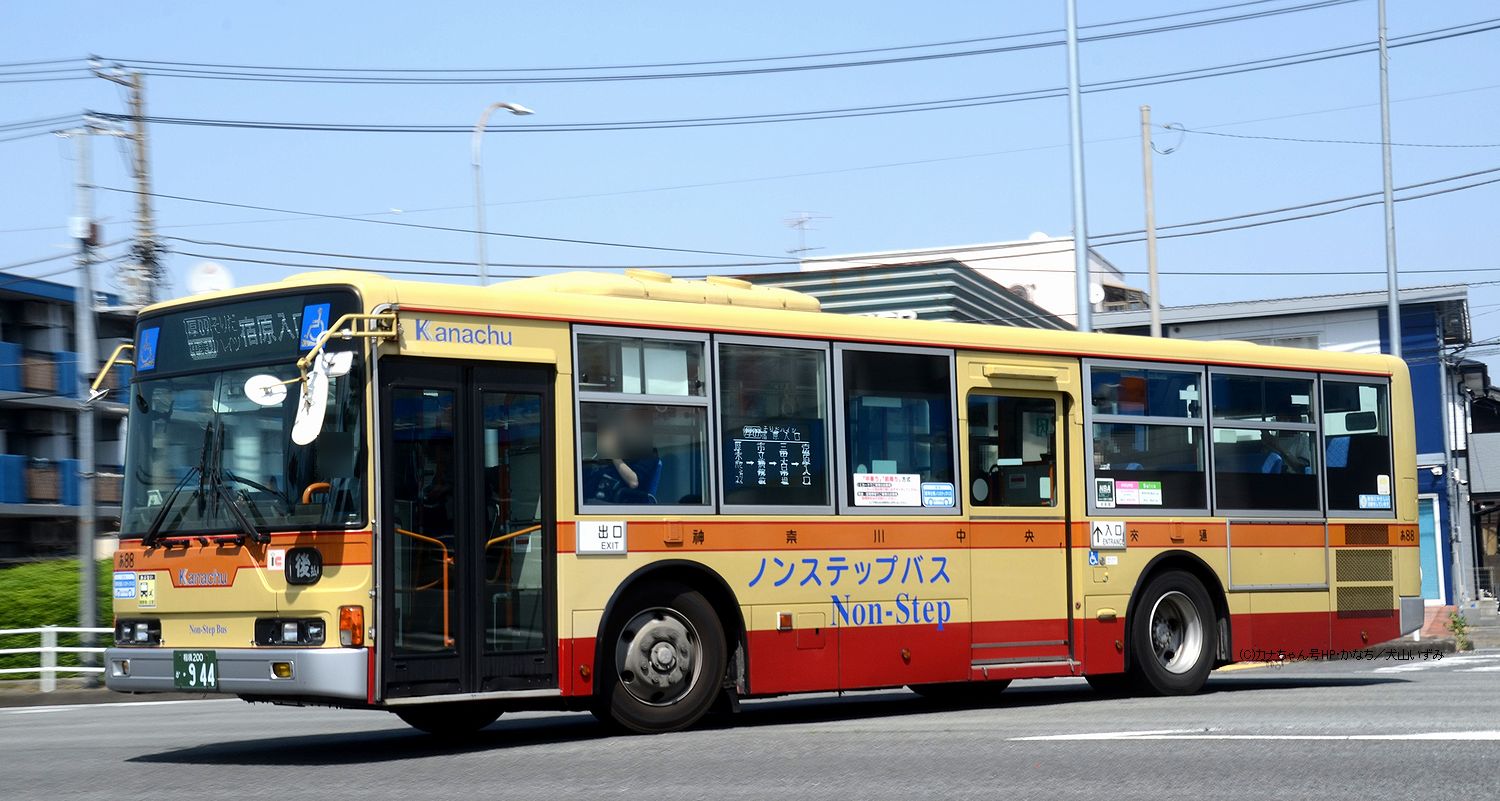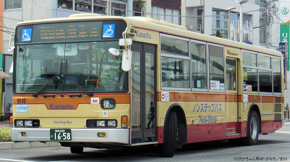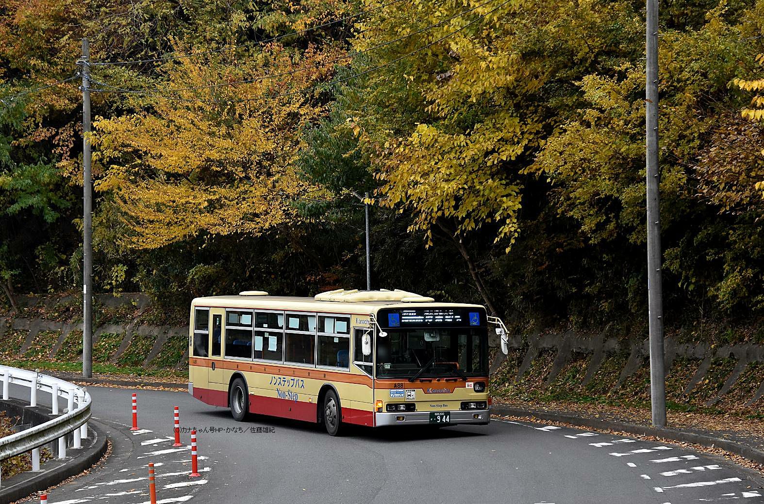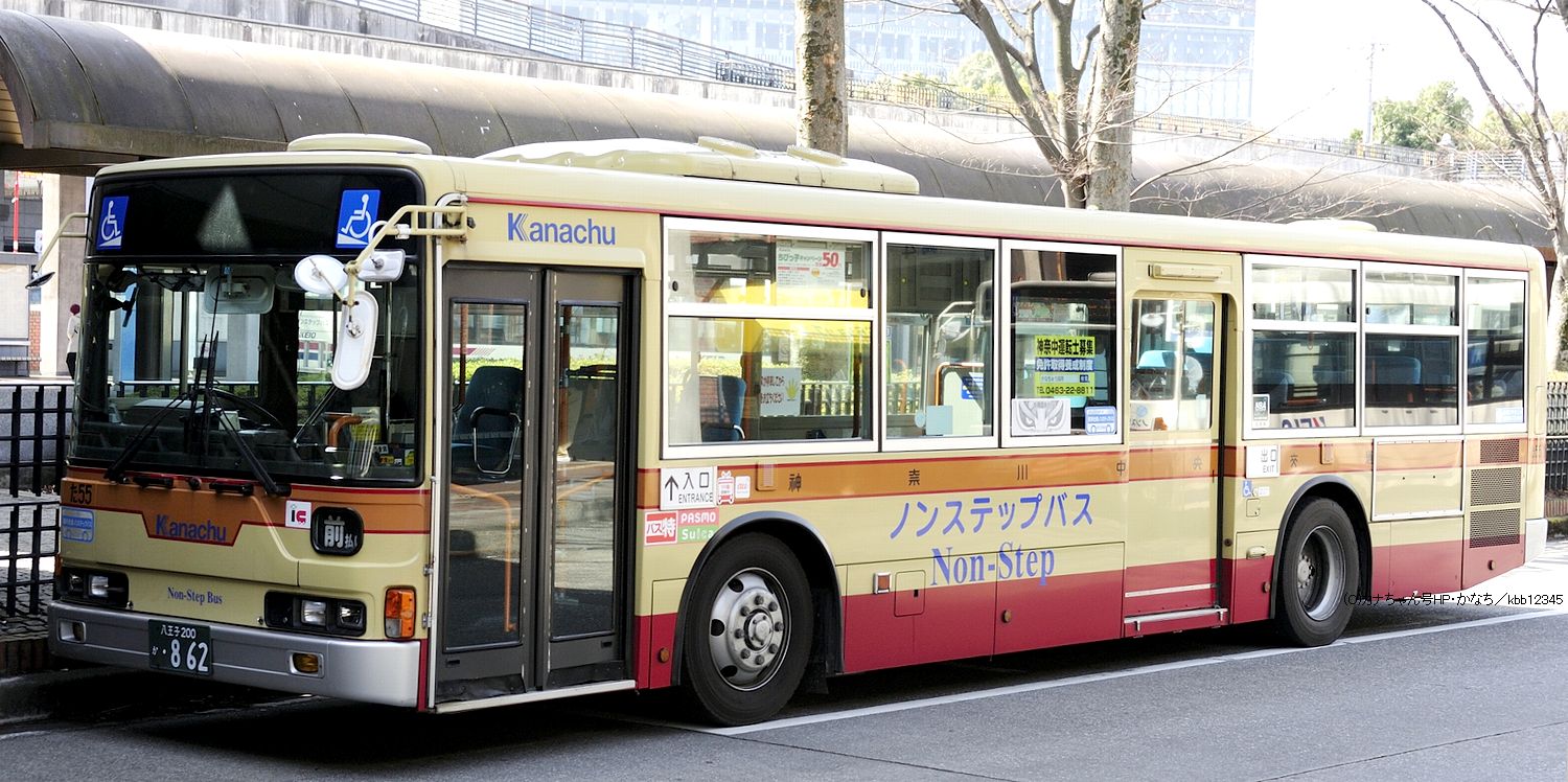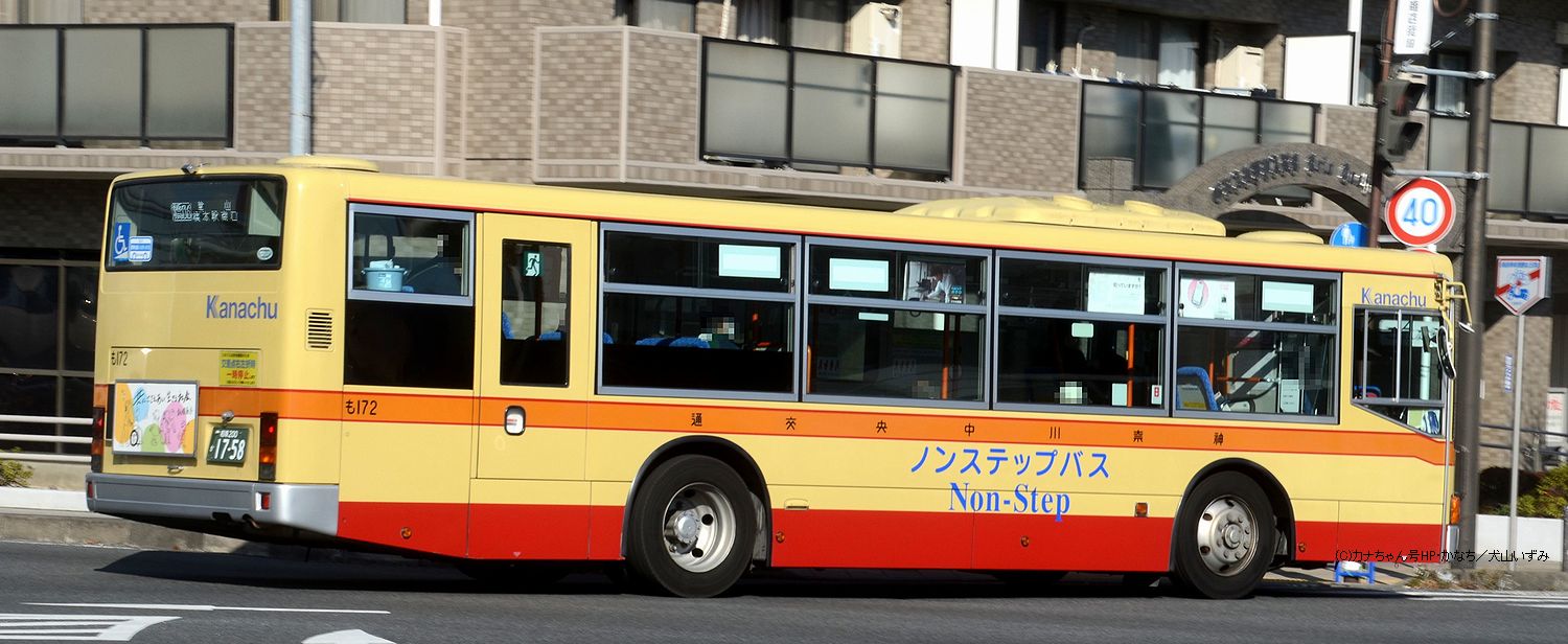2005年1月投入のPJ-MP37JM(さ10)です。PJ-代ノンステップは初投入となりました。ワンステップ車同様、正面に「かなちゅう」ロゴが入り、車椅子マークも両サイドに貼られています。また、国土交通省認定の標準仕様ノンステップバスで、それを示すステッカーも貼られています。今回もK・M尺の両方が導入されました。 |