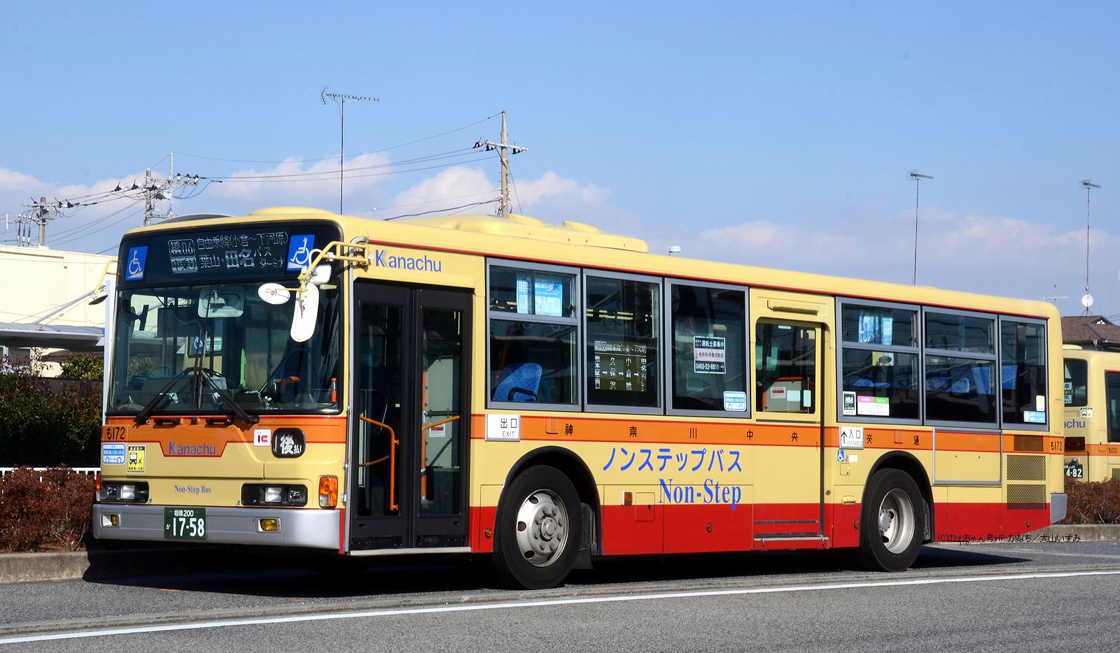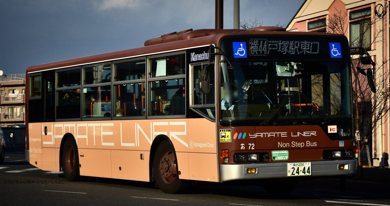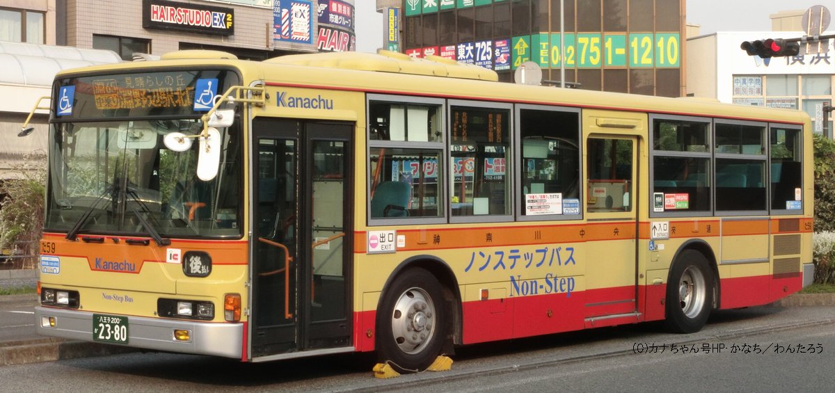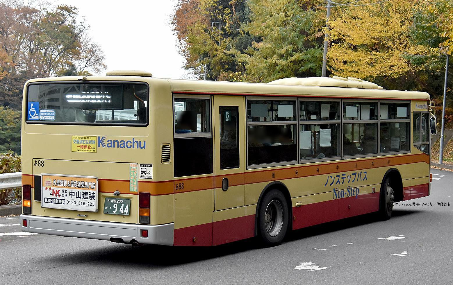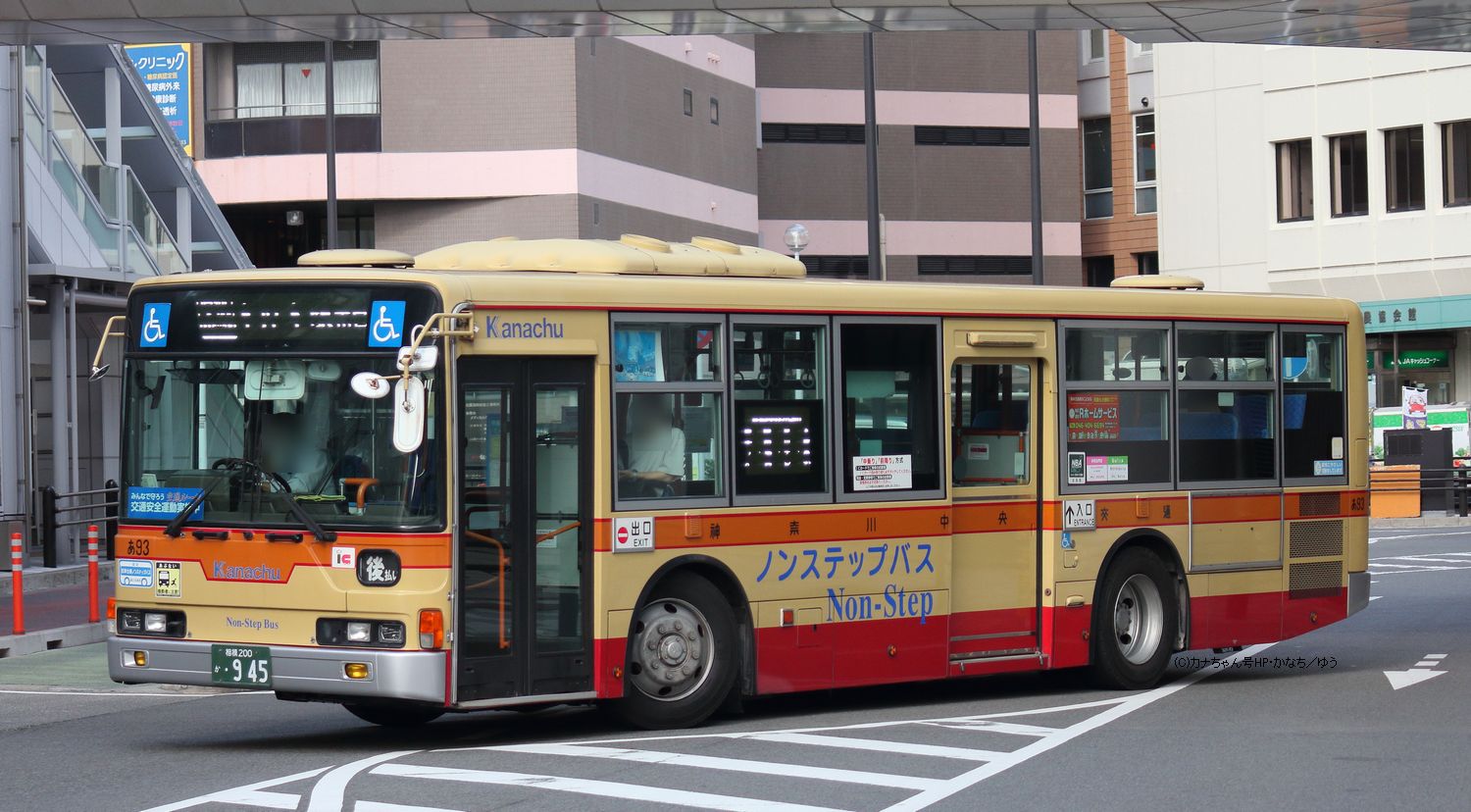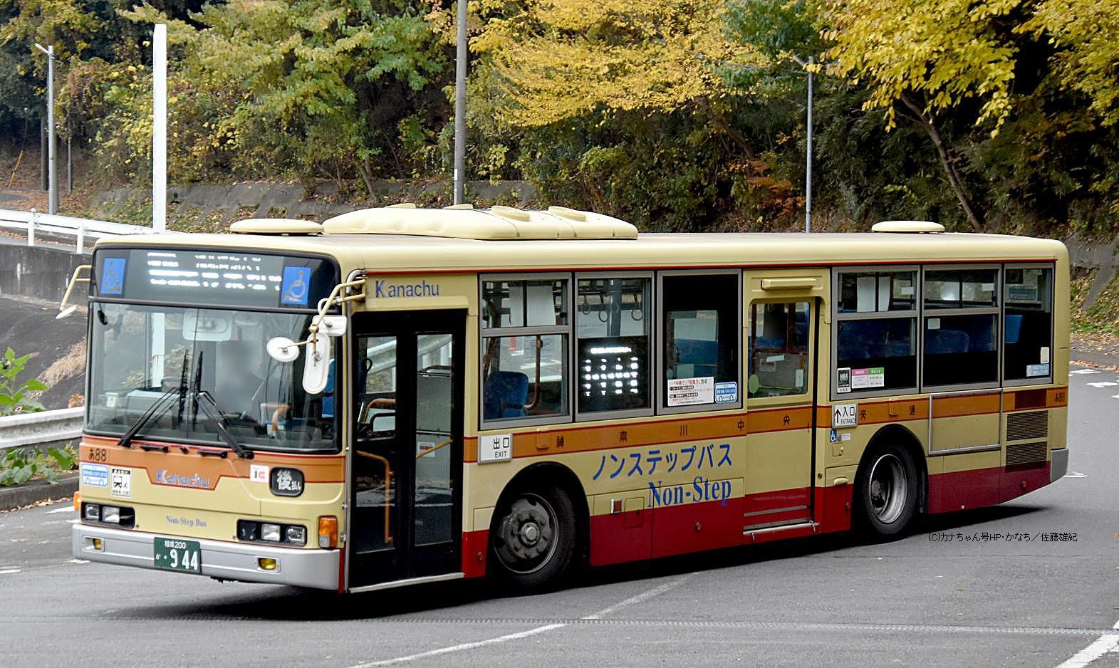 2005年1月投入のPJ-MP37JM(さ10)です。PJ-代ノンステップは初投入となりました。ワンステップ車同様、正面に「かなちゅう」ロゴが入り、車椅子マークも両サイドに貼られています。また、国土交通省認定の標準仕様ノンステップバスで、それを示すステッカーも貼られています。今回もK・M尺の両方が導入されました。 |