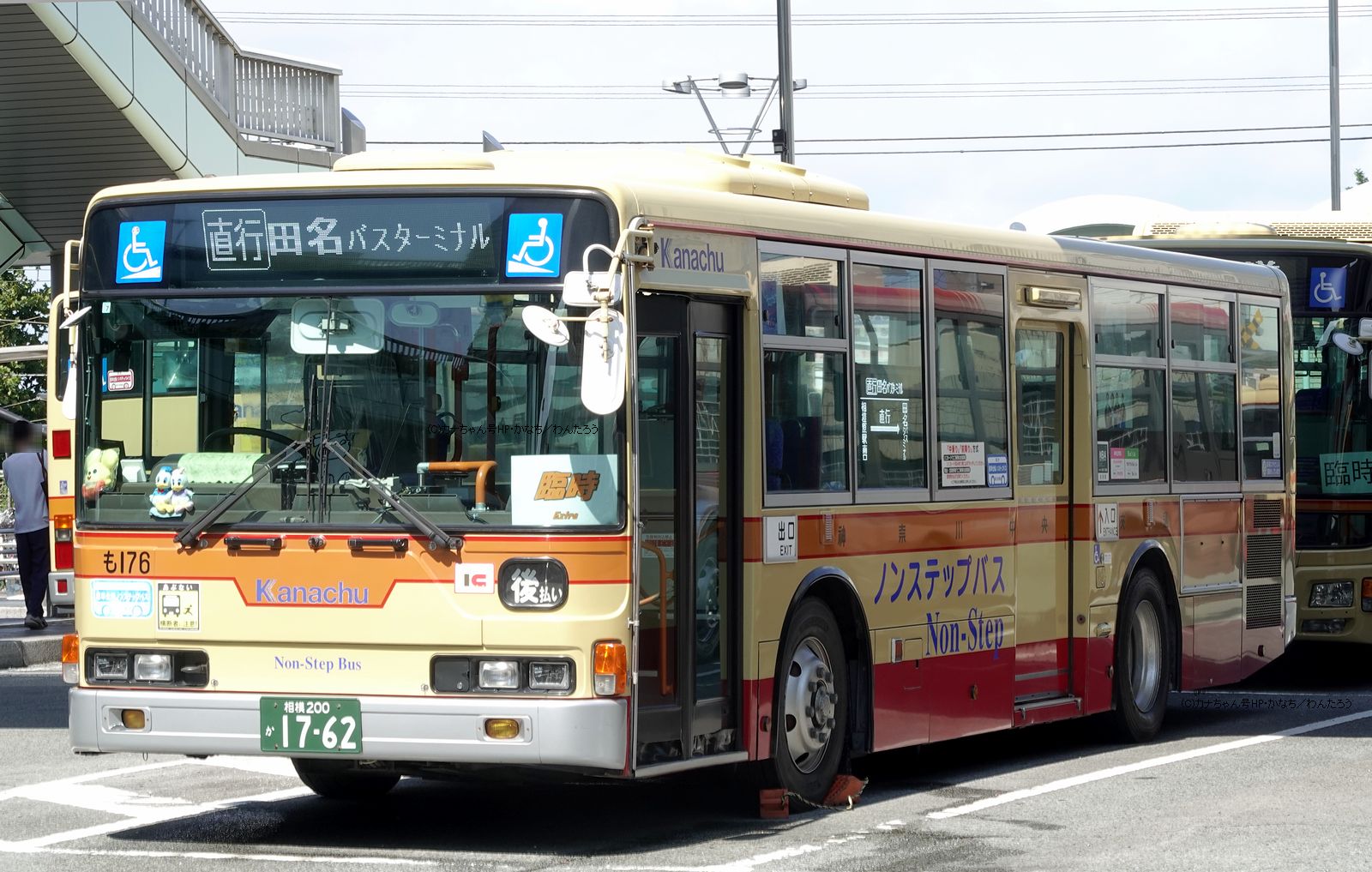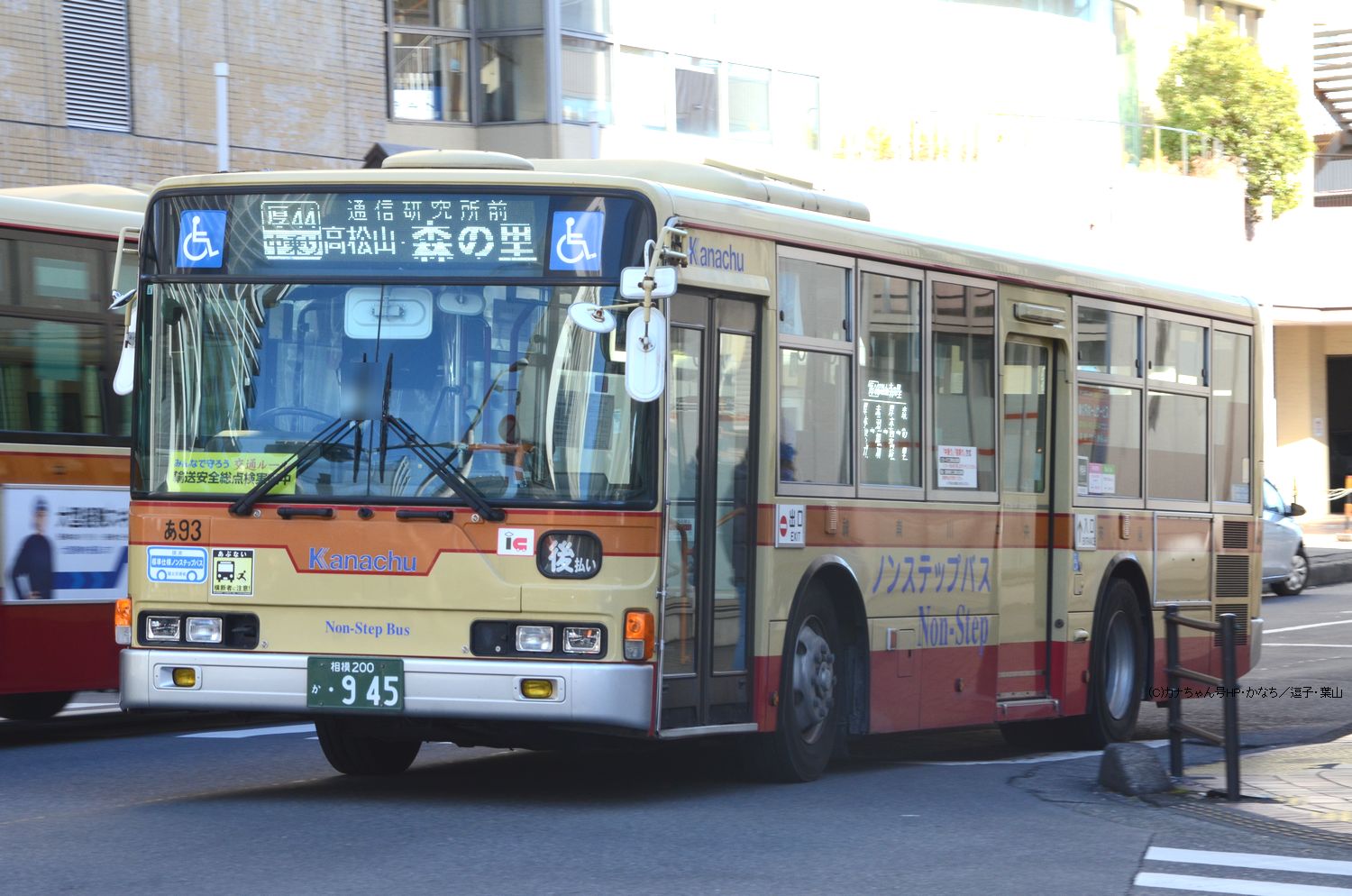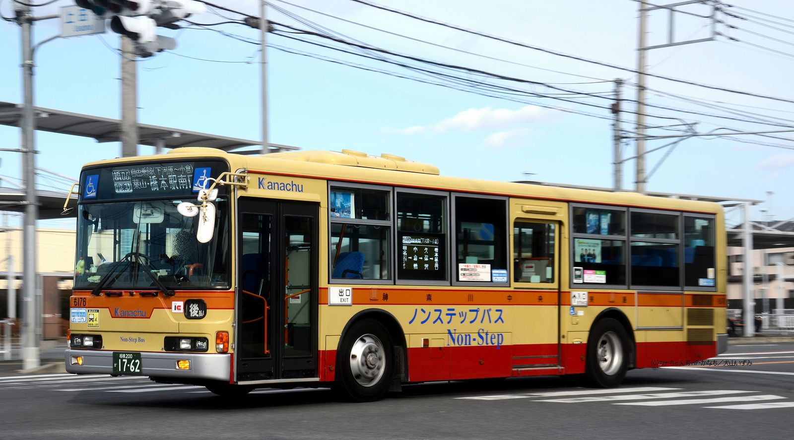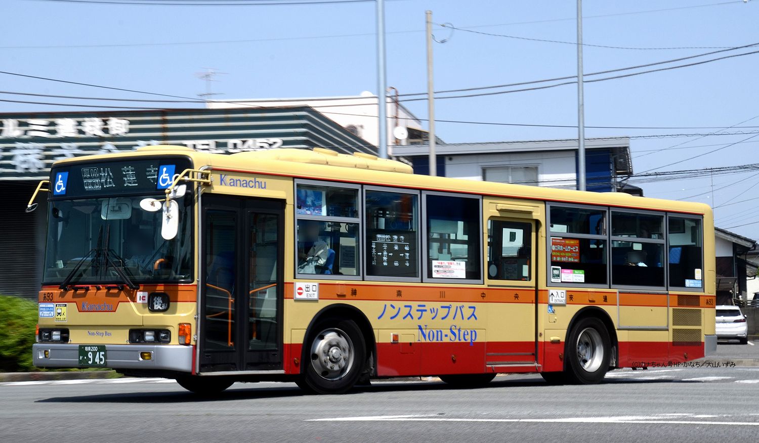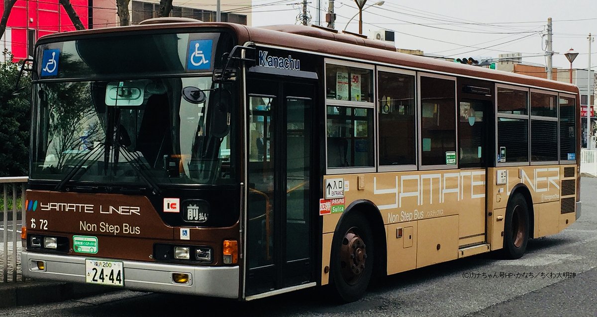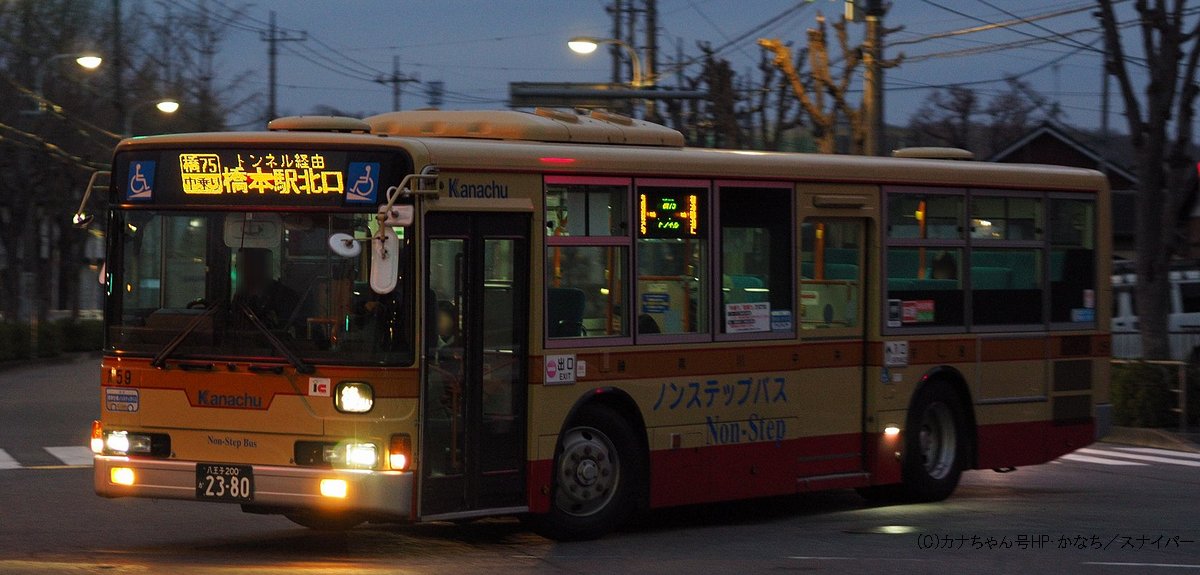 2005年1月投入のPJ-MP37JM(さ10)です。PJ-代ノンステップは初投入となりました。ワンステップ車同様、正面に「かなちゅう」ロゴが入り、車椅子マークも両サイドに貼られています。また、国土交通省認定の標準仕様ノンステップバスで、それを示すステッカーも貼られています。今回もK・M尺の両方が導入されました。 |