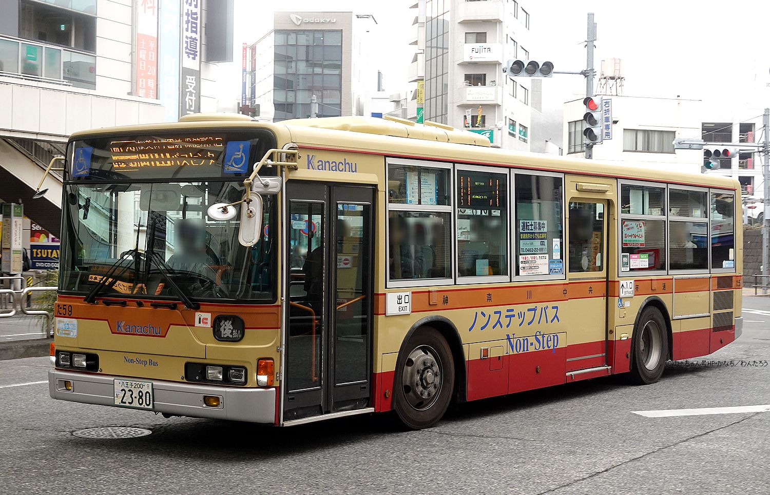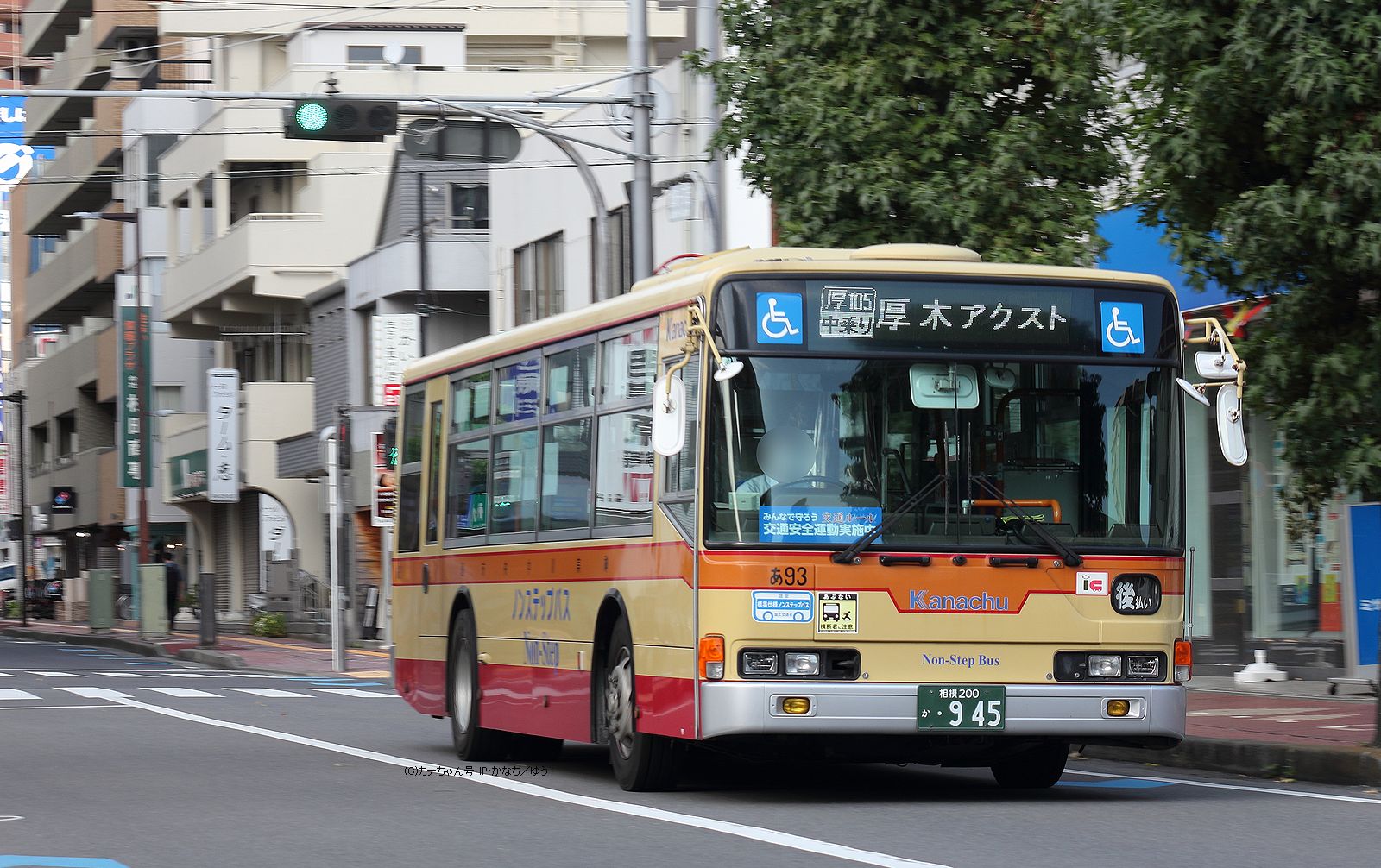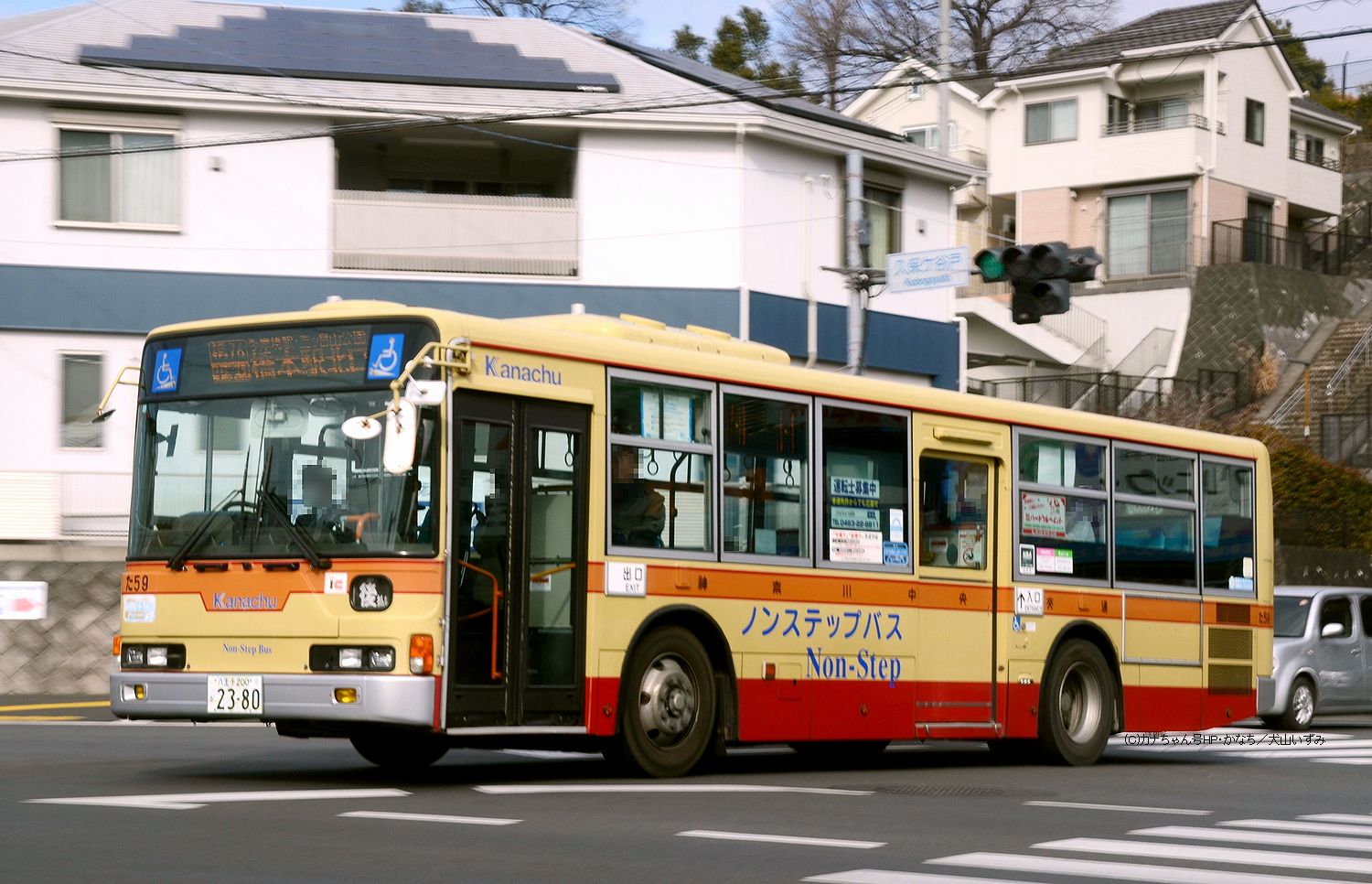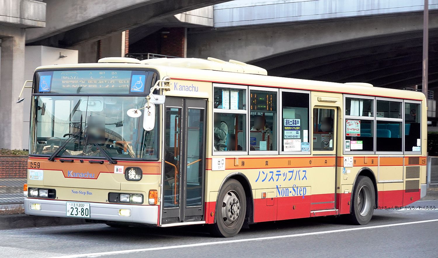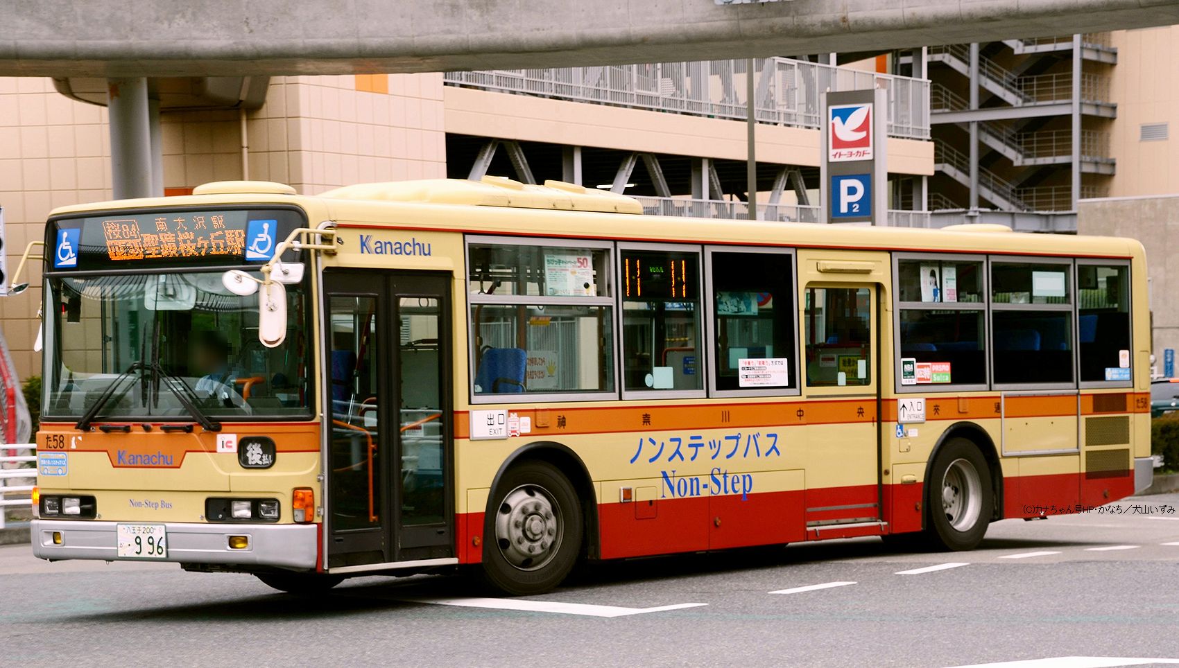 2005年1月投入のPJ-MP37JM(さ10)です。PJ-代ノンステップは初投入となりました。ワンステップ車同様、正面に「かなちゅう」ロゴが入り、車椅子マークも両サイドに貼られています。また、国土交通省認定の標準仕様ノンステップバスで、それを示すステッカーも貼られています。今回もK・M尺の両方が導入されました。 |