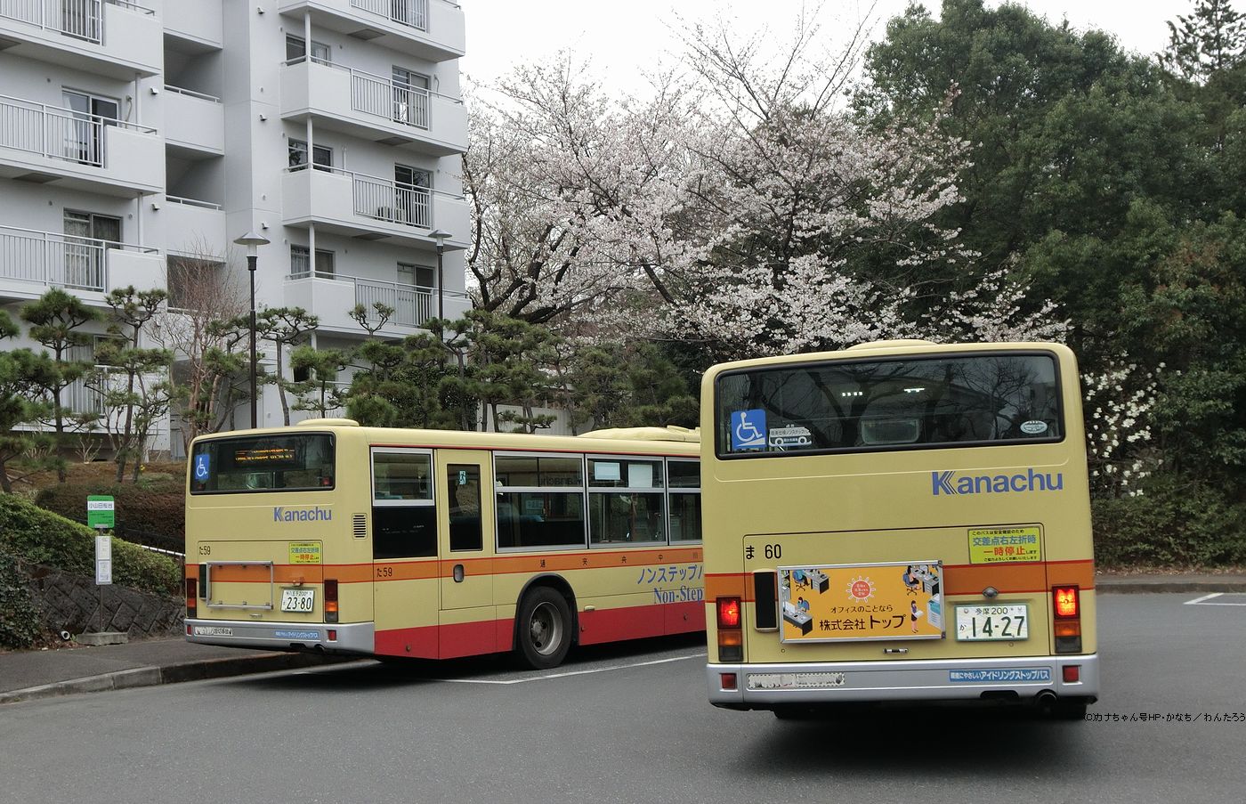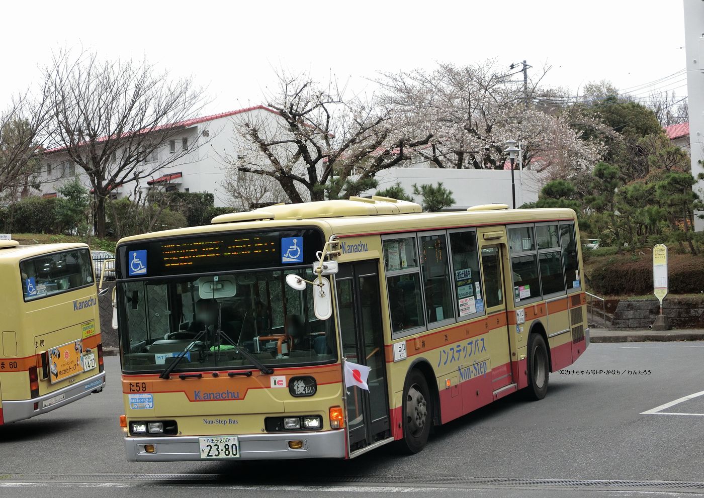 2006年1月投入のPJ-MP37JK(た59)です。 2019年3月に町田から転入した車で、同型のM尺のみが配属されていた多摩では唯一のK尺仕様となっています。 小山田桜台での記録で、今年も桜が開花しバスとの組み合わせも美しいです。 「ま60」は2006年12月投入の同型ですが、左の1月導入車のみリアウィンドウ左右に補助ブレーキ灯が増設されています。撮影 わんたろう様 |