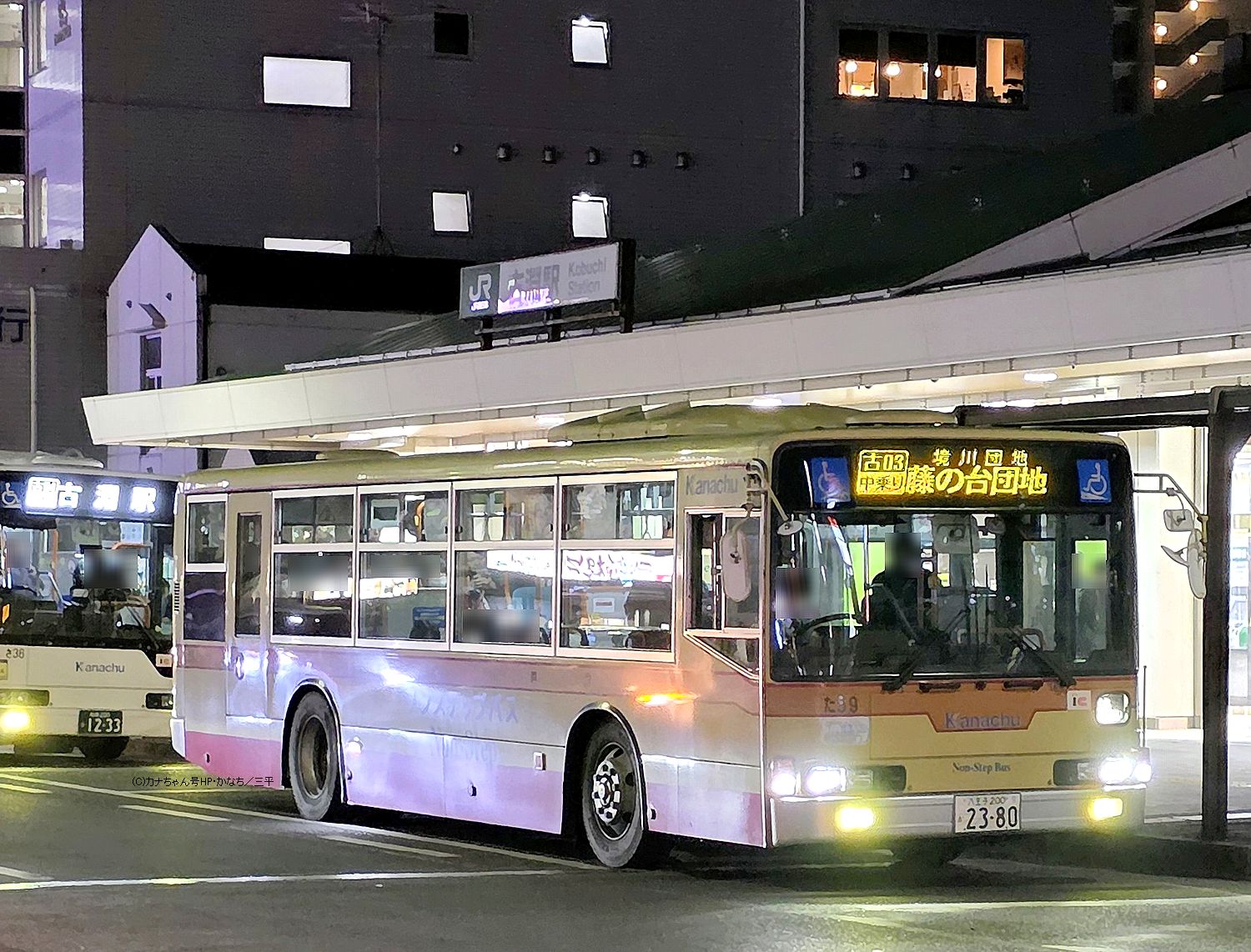 2006年1月投入のPJ-MP37JK(さ77)です。 5台が在籍する相模原営業所のPJ-代ノンステップバスの中では唯一の短いK尺仕様で、2019年に町田から転入した車両です。 写真は雨降る夕暮れの古淵駅前での場面で【古01】系統 北里大学病院・北里大学行の出発シーンです。撮影 三平様 |