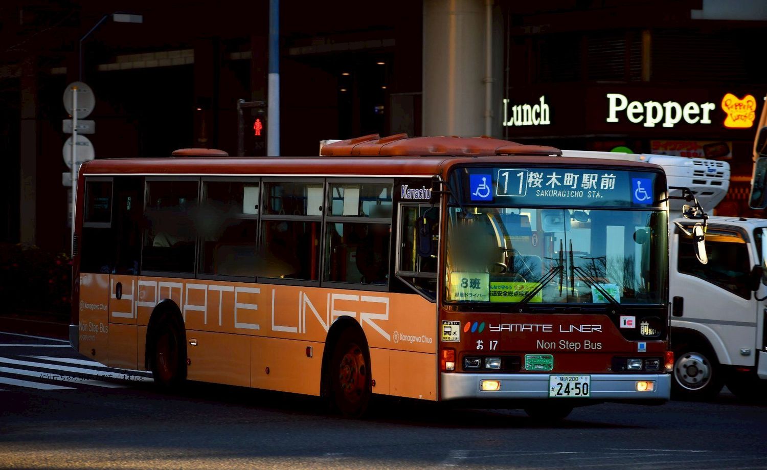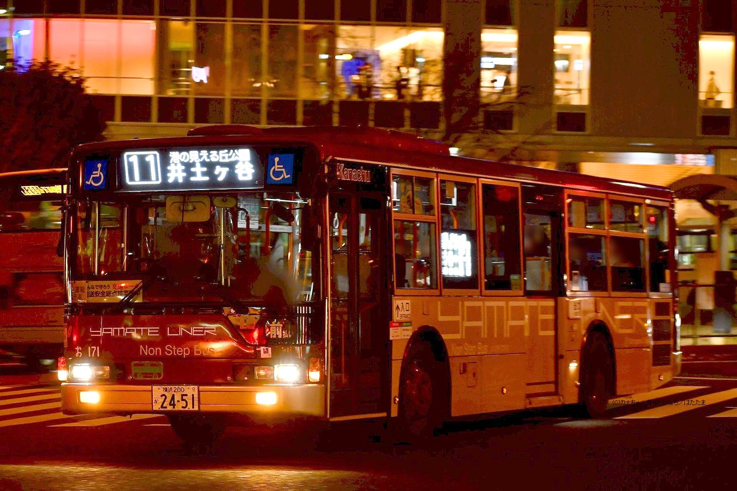 2006年1月投入のPJ-MP37JK(せ112)です。 夜の湘南ライフタウンで待機中の姿を捉えた1枚です。2016年6月に町田営業所から転入した車両で、綾瀬に在籍する3台のPJ-代ノンステップバスの内、K尺仕様は写真の車1台のみです。撮影 あやほう様 |