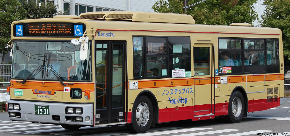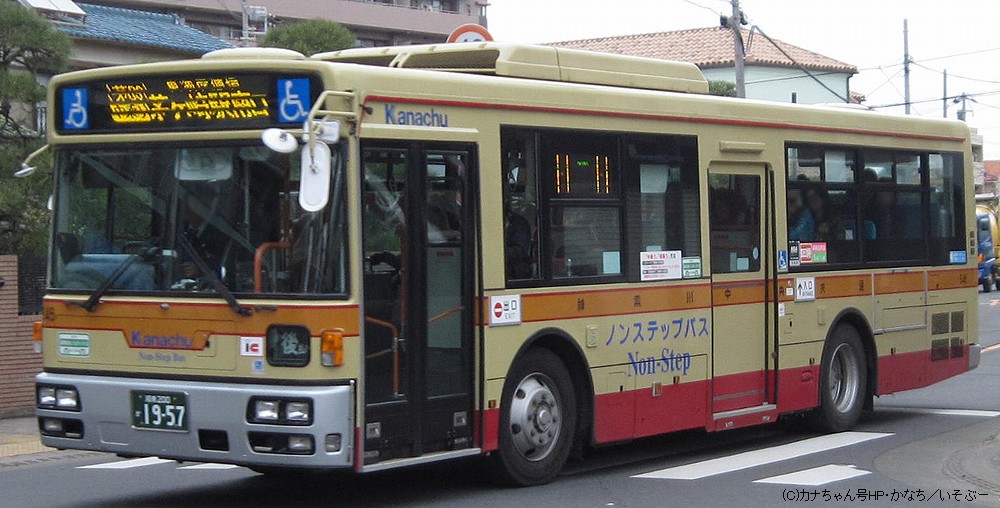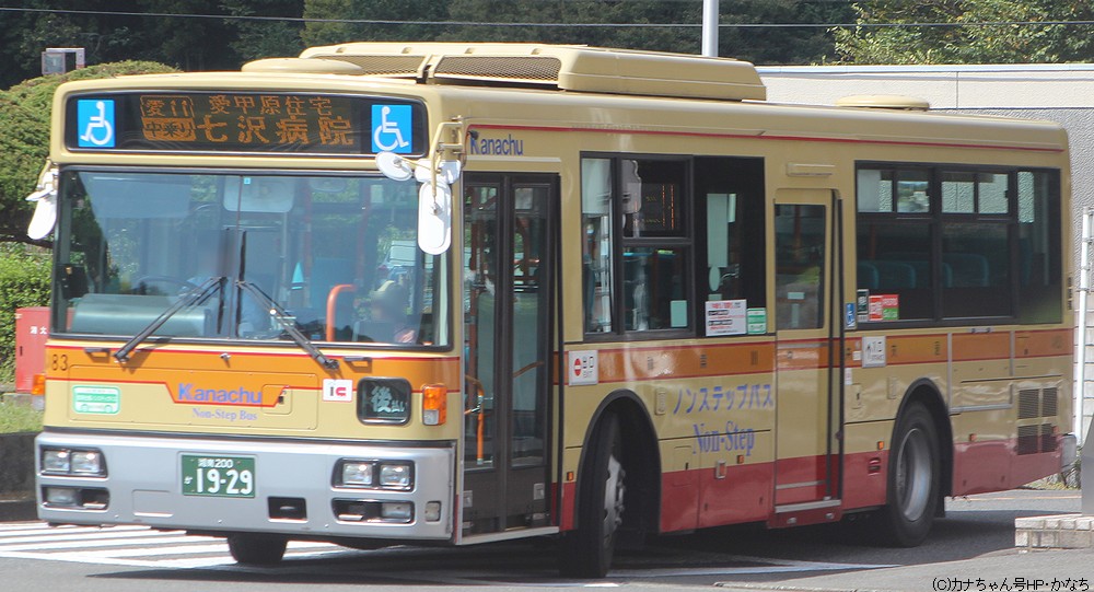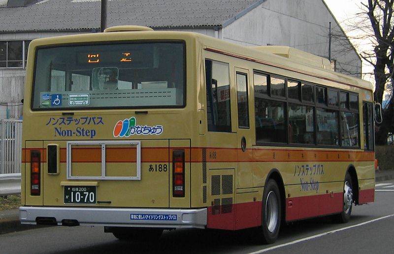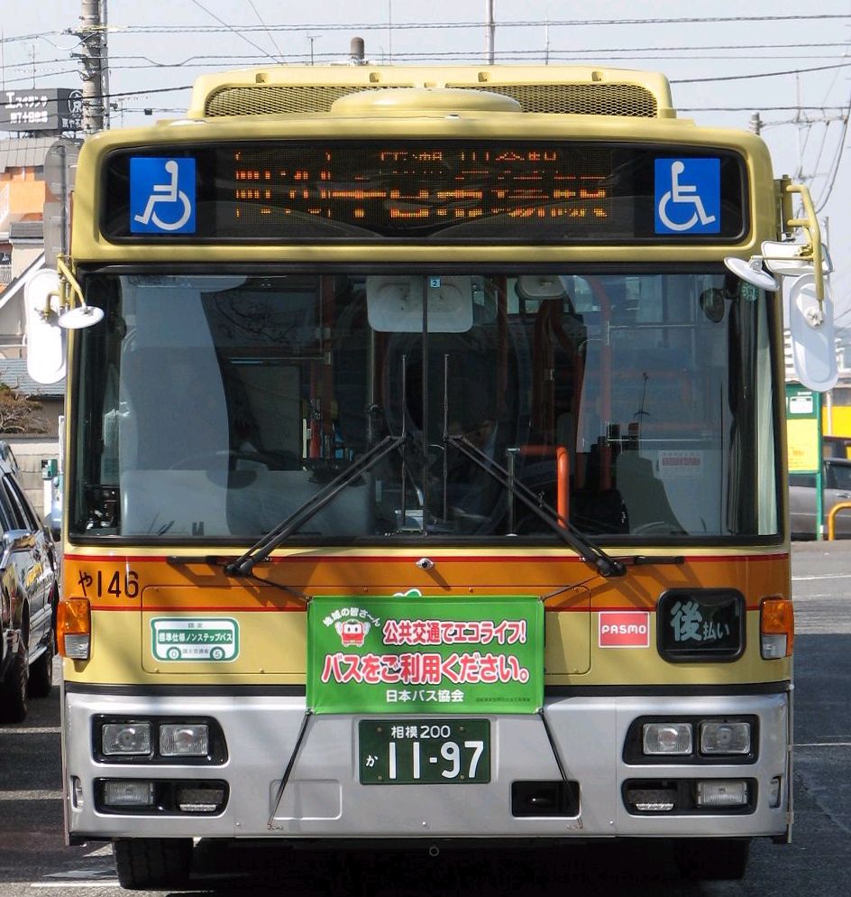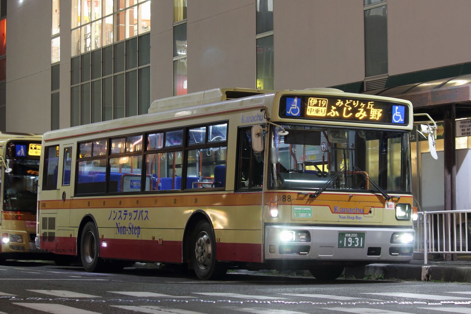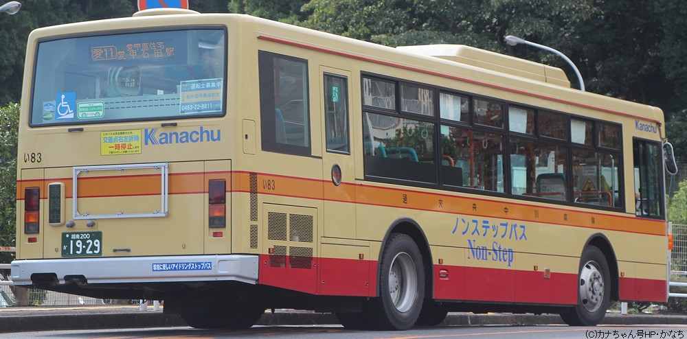 2008年10月投入のPKG-AA274KAN(い88)です。2015年10月に舞岡から転入した車で(元お0172)、同型は「い83、い88」の2台となり2001年式のエルガが引退しています。い88は運行初日となった10月6日から愛11系統 七沢病院線での運用が続いており、い83も運行初日は平塚駅方面へ平86系統等で運用されたものの、現在は愛11に固定されています。 |