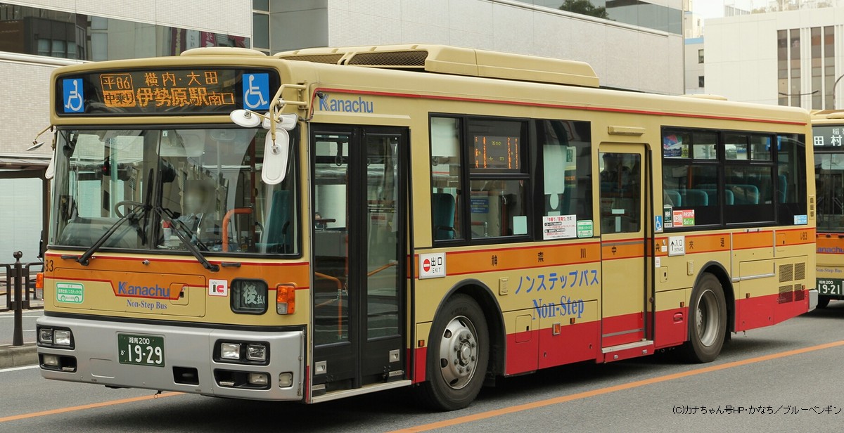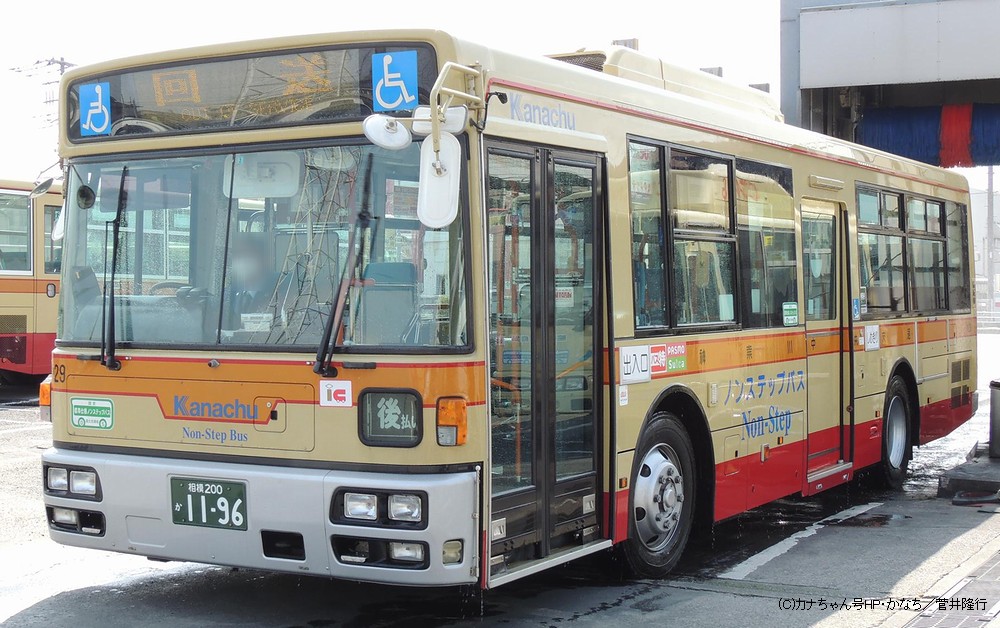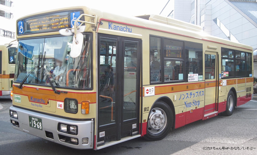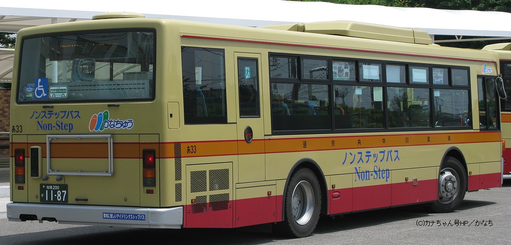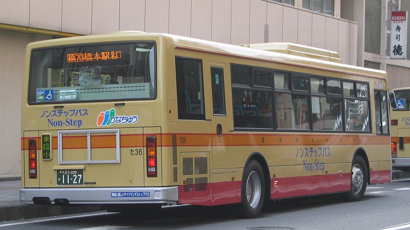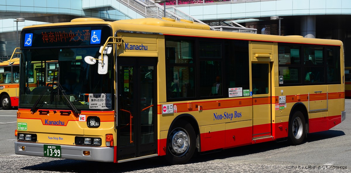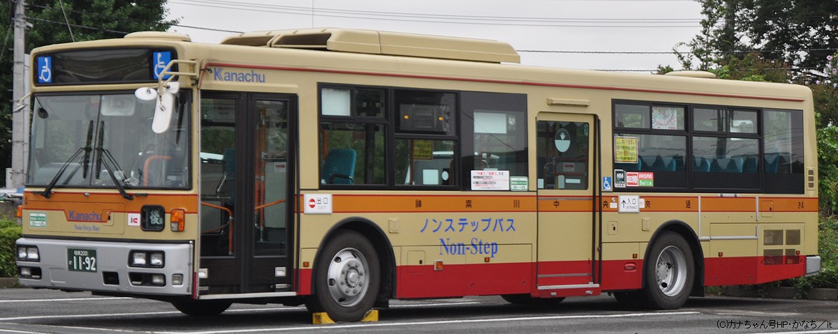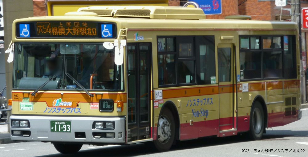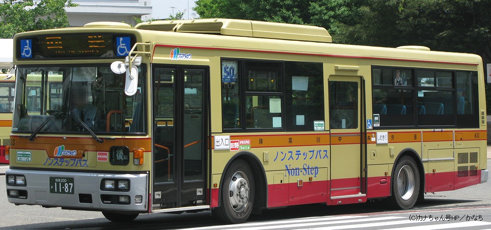 2008年10月投入のPKG-AA274KAN(い88)です。2015年10月に舞岡から転入した車で(元お0172)、同型は「い83、い88」の2台となり2001年式のエルガが引退しています。い88は運行初日となった10月6日から愛11系統 七沢病院線での運用が続いており、い83も運行初日は平塚駅方面へ平86系統等で運用されたものの、現在は愛11に固定されています。 |