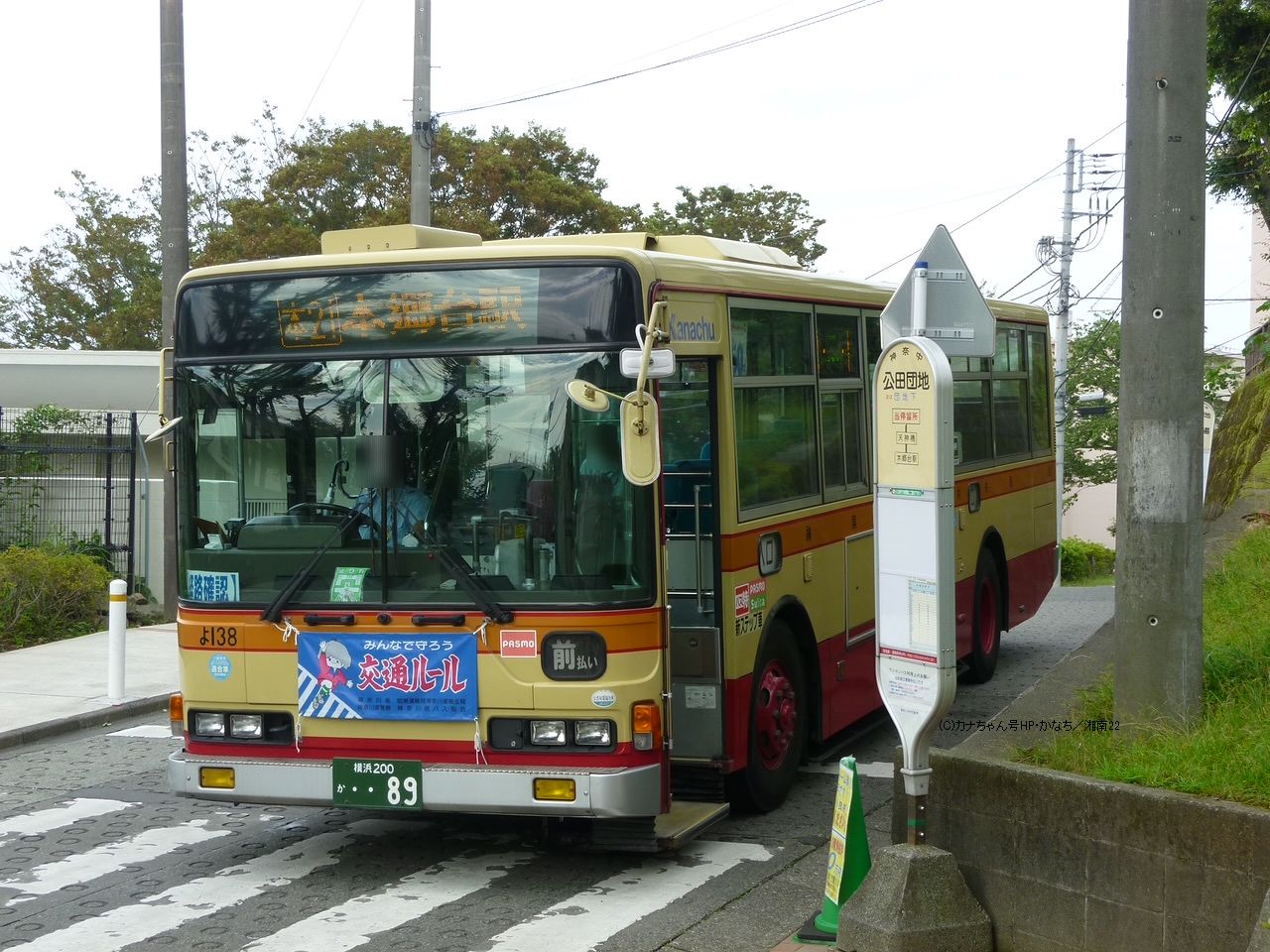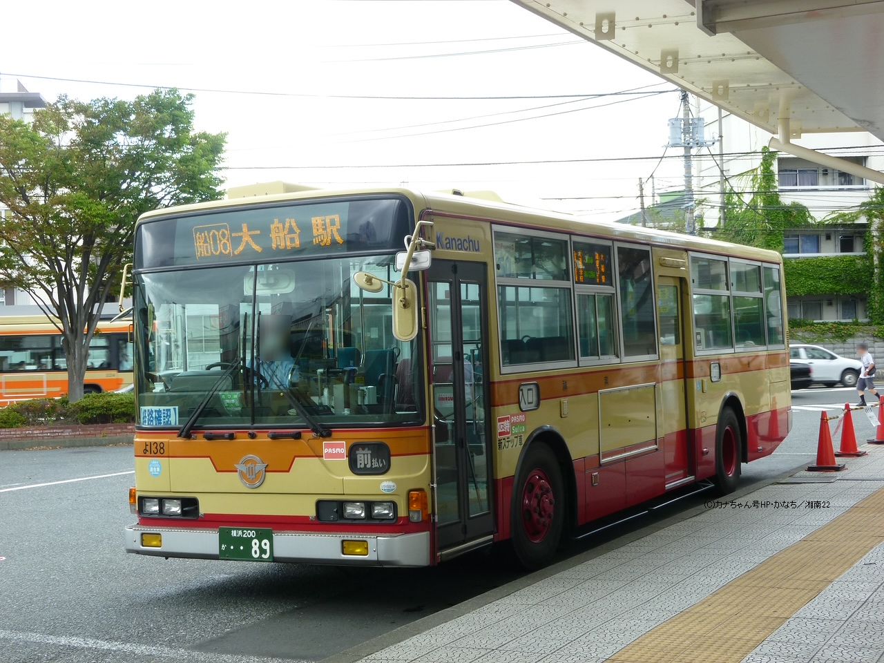 1999年11月投入のKC-MP317M(ひ068)です。この代の平塚車は写真の1台のみが在籍します。2008年までラッピングが施されていたため、ドア上やリアウィンドウにかなちゅうロゴステッカーが張られています。昨年までは中ドア戸袋窓にも張られていましたが90周年ステッカー掲出の際に剥がされたようです。撮影 Yu131様 |