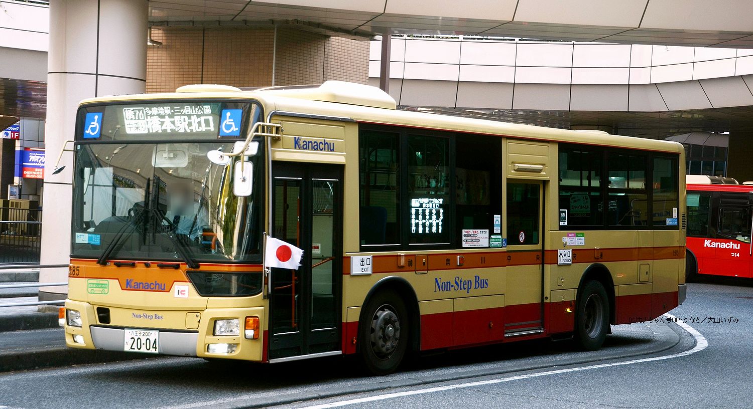 2016年3月投入のQKG-MP38FK(た85)です。 多摩営業所には23台が在籍するQKG-代のMP38で橋本駅北口で待機中の姿です。祝日の記録ですが風に靡いた国旗が映えます。撮影 犬山いずみ様 |