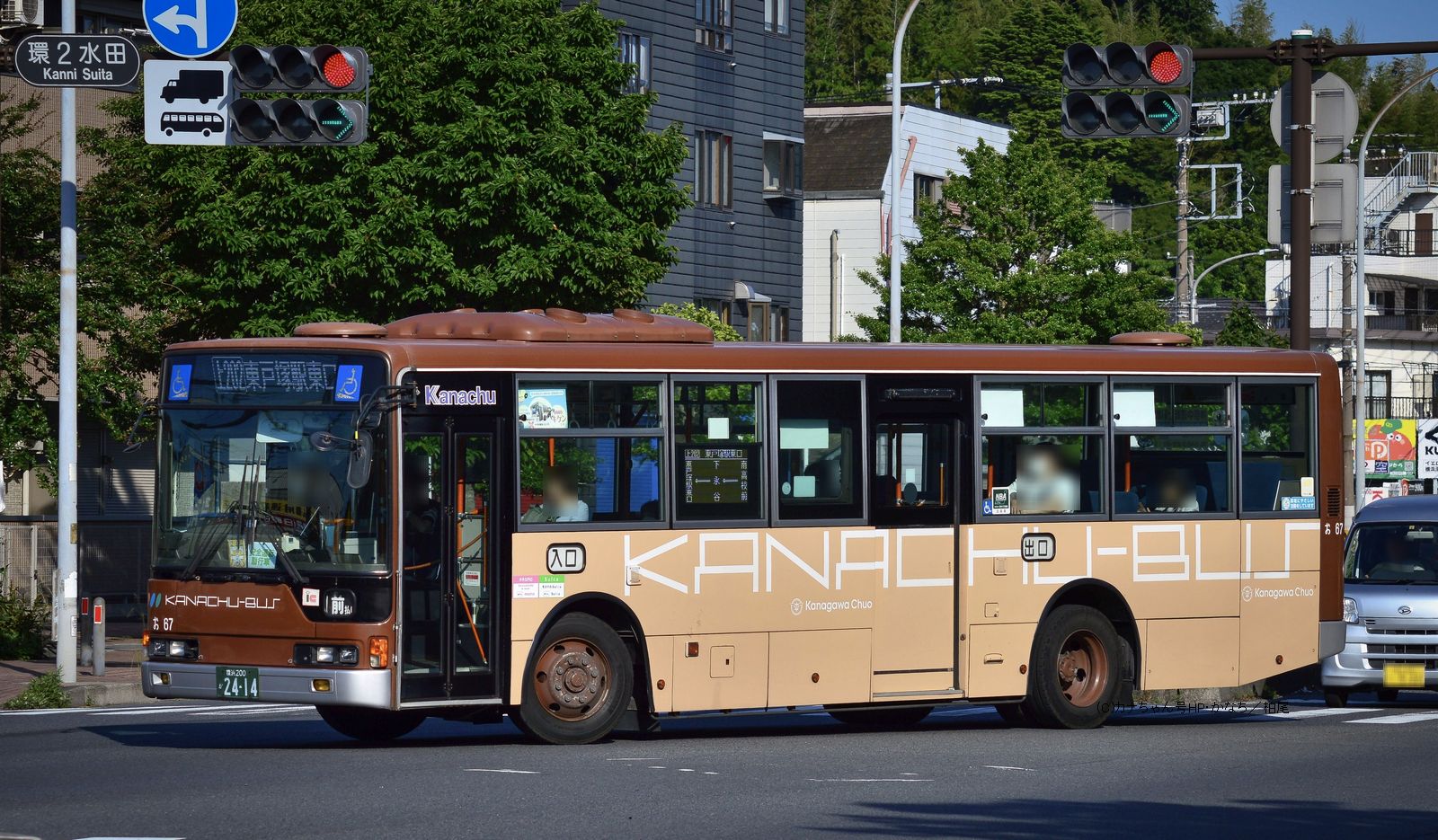 2007年3月投入のPJ-MP35JM(お 67)です。 「KANACHU BUS」仕様です。YAMATE LINER仕様のワンステップ3台についてはこの1月に全廃となっていますが、 こちらのタイプは1台も引退は発生しておらず、舞岡の8台、秦野の運転訓練車も健在、この2025年度も生き残りそうでしょうか。撮影 柏尾様 |